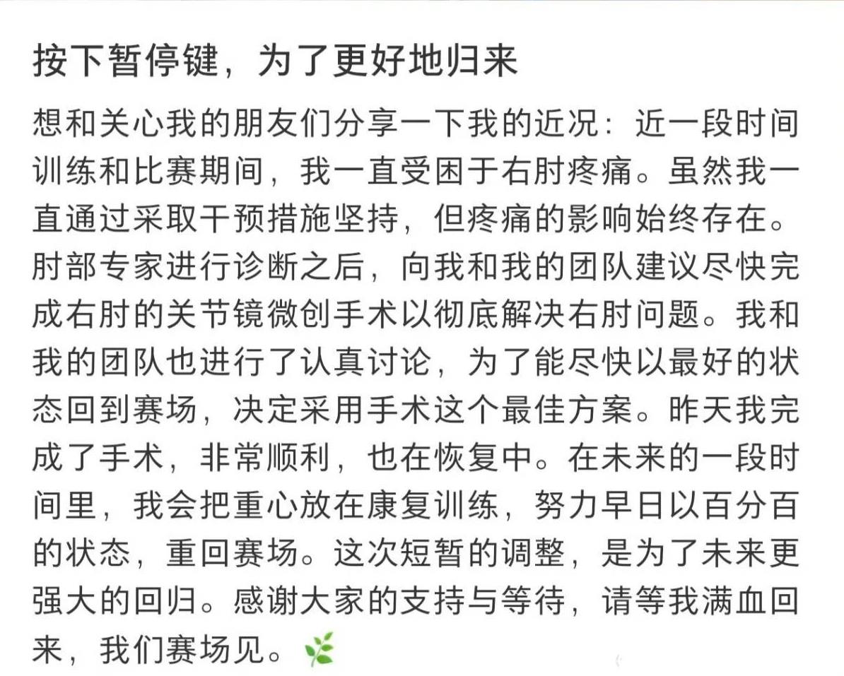 郑钦文发文晒病床照:昨天完成了困扰自己已久的右手肘微创手术。 说郑钦文炸伤的人可以消停了。 郑钦文去年总决赛进四强,手肘就受伤了。之后一直带伤参加比赛,采用干预措施保守治疗,没有办法彻底解决问题,为了尽快摆脱伤病的困扰,郑钦文昨天在西班牙完成了手术治疗。 手肘手术及术后康复,至少需要两三个月左右。对于郑钦文的球迷来讲,这段时间不能看到她的比赛,无疑是失落的。 不过比起失落,郑钦文的健康回归才是最重要,大家更希望看到满血归来的钦文。 祝郑钦文早日康复,健康回归!