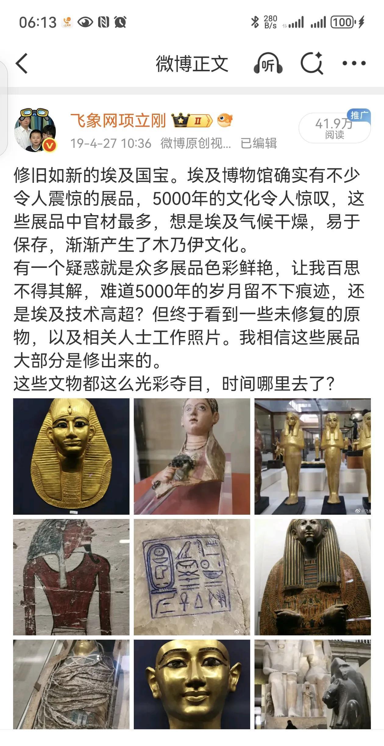 #做早饭时想# 【埃及的那些文物就是修出来的】 周末我继续说点轻松话题,最近网上看西方伪史论,吵得不亦乐乎,其实很多不是史的研究,就是意识形态,有些人就想掀掉西方那个神话,对有些人而言,西方那是精神祖坟,这是不能碰的,一定要下功夫维护。 我的感觉是这样,随着中国的强大,年轻的一代会越来越怀疑西方的那些东西,一定是加了很多水,是经不住考验的。老油渣们再维护, 也很难守护得住,因为很多造假,还有很多修得完全背离了真实的感觉。 这两天我看网上争论埃及那个展览的拖鞋是不是一眼假?有人说,埃及的拖鞋保存了几千年,还是那样如新的一样,这是真的,这当然是很扯淡。 对于埃及的这些情况,我略微有点发言权,2019年我受邀请去埃及讲课,去参观过他们的博物馆。埃及的博物馆和中国的博物馆,有一个非常大的不同,就是修旧如新,我们看到埃及博物馆里面的各种展品,什么木乃伊之类,都是和新的一样,色彩非常鲜艳,新的令人疑惑,这是不是真实的情况,是不是经过了几千年,这些文物并不氧化,一直保持着原来的颜色? 肯定不是这样,木乃伊那些新鲜的颜色就是新涂上去的,根本不存在几千年还不氧化的情况,这件事情2019年我参观埃及的博物馆就说到过,其实博物馆里除了这些修复的非常鲜艳的展品,也有一些木乃伊是原貌,那也是氧化的很严重,一看就有几千年的痕迹,只是因为相对干燥,并未完全腐化。 其实对于埃及的文物是修出来的,埃及博物馆并不隐晦,甚至专门有一个地方做了很多介绍,介绍他们是怎么修复的,告诉大家有这么一个机构存在。 我看对于文物的修复,中国和埃及有一个很大的区别,中国追求的是修旧如旧,我们看到很多的文物,只是做了一些复原,很容易看出来历史的痕迹。我看埃及对文物的态度,就是修旧如新,埃及国家博物馆也是这么干的,修出来的文物和新的一样,基本上是破坏了它的历史痕迹。木乃伊弄得那么鲜艳,就是重涂了漆,不可能原来那么鲜艳,还能几千年保留。尤其那个面具,那种金光闪闪,完全是否定的氧化作用。 以中国人严谨的科学态度,中国人对历史的态度,去看埃及那些文物,确实很多令人怀疑,觉得这很扯淡,这是很正常的。如果中国的文物都是这么搞,不说外国质疑,中国人自己也不相信。 我们姑且认为埃及的那些文物就是真的,但是他们对于修复文物的态度,基本上是破坏历史,破坏那种真实的感觉,把几千年的岁月痕迹都抹去了,把文物搞得像山寨厂造出来的一样,经埃及那些部门修复的文物,确实和潘家园的那些没什么两样,潘家园有时候还造的更像一些。 历史的痕迹是挺复杂的,关于历史的研究有许多专业的知识,我肯定不是这方面专家,闲扯几句也是自己亲眼所见。 现在关于西方伪史论,争论的双方经常都没有真实的考据,也没有真实的资料,就是凭着感觉。我看是争不出什么结果。但是从大的格局来说,历史的发展一定是有传承的,历史的发展也是经济、文化的一个组成部分。最近我就很关注美食与历史,一个经济非常强大的文化,一个非常厚重的文明,连美食都没有,我就非常怀疑是不是真的。 中华文明一定是世界上最伟大的文明,最伟大的没有之一,一套几千年的制度,中央集权、郡县管理、土地国有、官员流动、论功行赏,统一度量衡、统一市场、统一交通体系、统一文字,几千年我们一直都在用,这个古代文明一定是存在的。 今天我们中国人用瓷器,穿丝绸,喝茶,一个一吃就胀气的黄豆,中国人把它做成了豆浆、豆腐脑、豆腐、豆干、豆皮,相关的菜有上千种,各种变化无穷。几千年一直在传承,这是不可怀疑的文明。 今天中国有14亿人口,这就是几千年传承、积累的结果,这也是不可怀疑的文明。 有人要怀疑古希腊、古埃及,没办法阻止怀疑,因为没有传承,看看那些文物都被涂得像新的一样,这能怪谁?