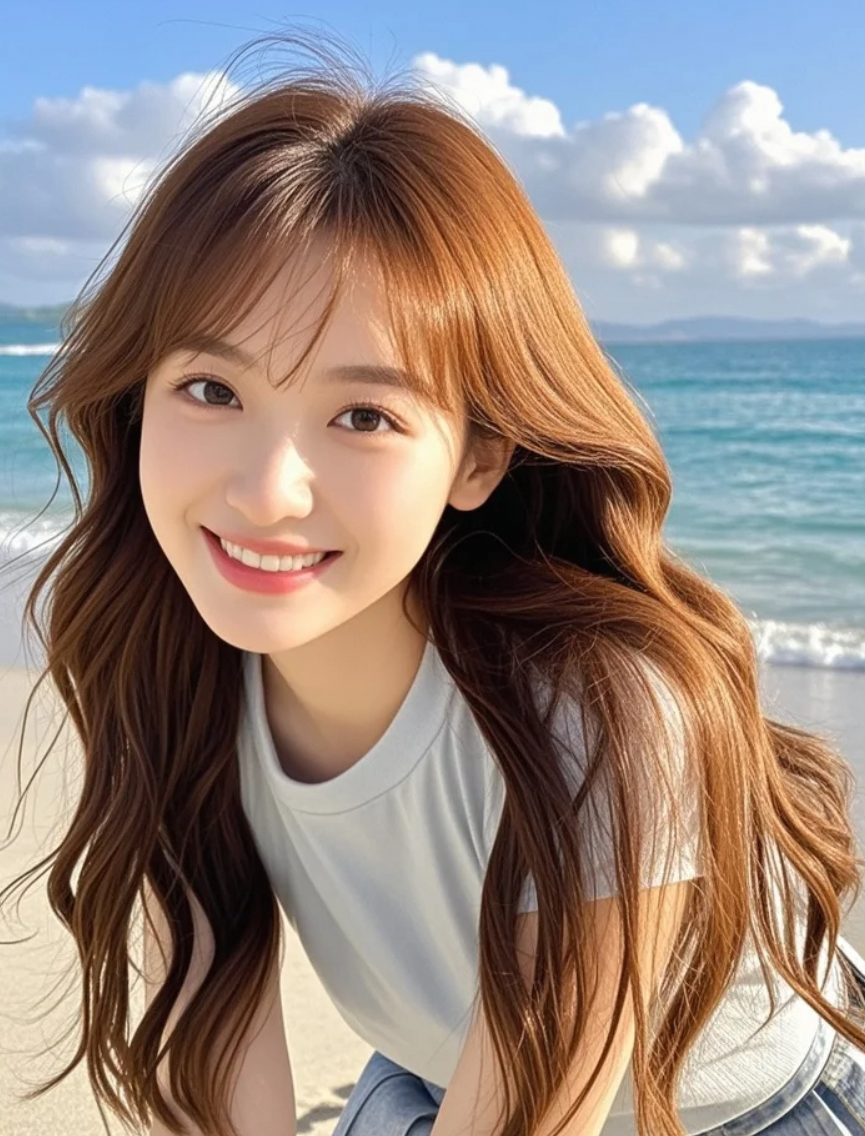 清新脱俗的身影在沙滩上,长发随风,笑容如阳光般温暖