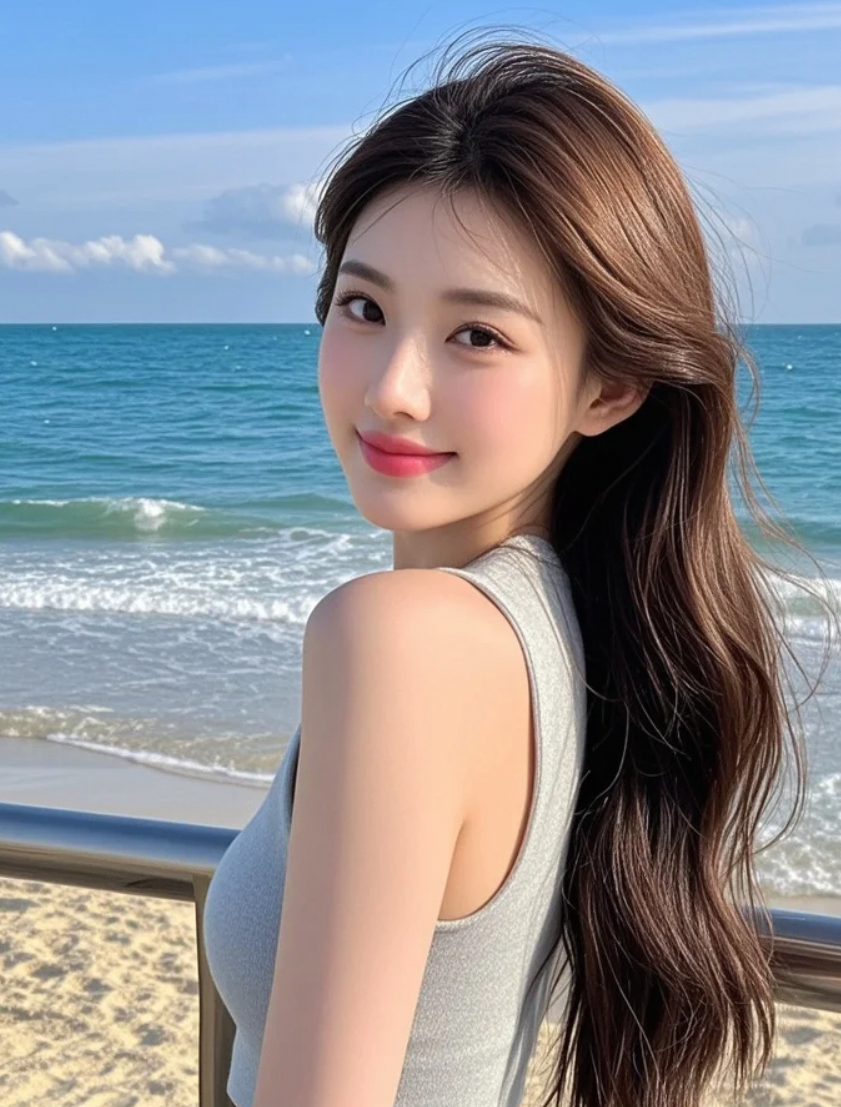 阳光明媚的海岸边,她浅笑盈盈,长发与T恤共谱青春乐章