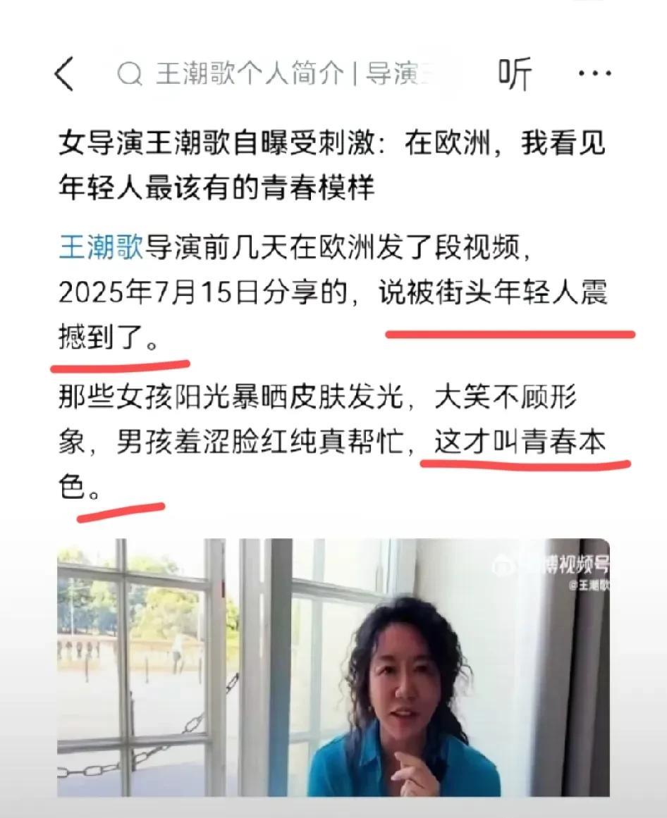 中国的年轻人明明很优秀,却被国内女导演否定了? 近日,女导演王潮歌一番话很像《意林》:“欧洲的年轻人才是年轻人该有的模样,女的暴晒后皮肤发亮、大笑起来不顾形象,男的羞涩脸红纯真地帮忙。中国的年轻人学习打工累成狗,该重新思考青春该怎么过了!” 大家看到这些话会发觉有问题吗?表面上看似乎没什么问题,可实际上问题很大,那就是罔顾事实、不顾真相地美化外国人,贬低国内年轻一代,试图误导国内的年轻人。 为何这么说呢?因为这位女导演不顾事实真相。是什么样的事实呢?事实就是中国近一两百年来处于落后追赶的状态,若不是老一辈人奋力守护,中国就不只是半殖民地这么简单了。 要是沦为全殖民地,中国人的命运会怎样?中国5000年的文明史是否就会就此终结?这个世界上还会有中华文明、还会有汉语吗? 不仅如此,中国人在短短几十年间追赶了上来了。要达成这些成就,每一代中国人都要有民族复兴的责任感,每一代年轻人都肩负着重任,每一代人都得拼命奋斗。 因为中国无论何时,在西方国家眼中都是一块肥肉,不够强大就会任人宰割。 除非我们放弃,我们投降,甘愿成为西方国家的附庸。 在这样的大环境下,在我们还处于落后的时候,中国人有什么理由放松,有什么理由不去拼搏奋斗呢? 除非这个人没有家国观念,不把中国当作自己的祖国,他们觉得中国人应该满足现状了,应该有小资情怀了,应该享受他们眼中的那种自由生活了。 王导演这番话也是别有用心,细思极恐。女的要追求自由不顾形象,这不是男性的形象吗?男的反而像女性那样羞涩,这不是失去了阳刚之气吗? 这难道不是想暗示国内年轻男女颠倒吗?这难道不是另一个版本的lgbt吗?欧洲的风气就这样子,巴黎奥运会上那荒诞长胡子的女人,大家都忘了吗? 而且欧洲的国家基本都成了头号强国的附庸,现在开始落后了,他们的年轻一代,如果真的像王导演所说的不学习不打工,他们的落后就是咎由自取。 不过他们还有殖民时期掠夺的财富可以维持。然而中国人的财富积累干干净净,是从一穷二白起步的,每一分钱都是通过劳动获得的,我们想要民族复兴、国家强大,就是要打工、要学习、要超越,而且我们已经做到了。 难道王导演这类人不为此感到光荣,反而以此为耻吗?打工可耻,学习可悲? 要对这些人保持警惕啊!大家怎么看呢?