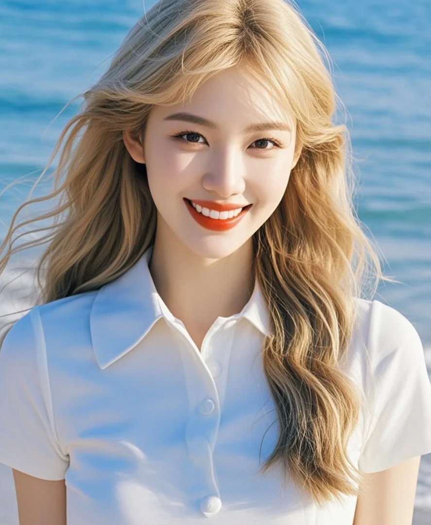 沙滩之上,她身着素雅T恤,长发随晚风轻扬,笑容如晨曦般温柔动人