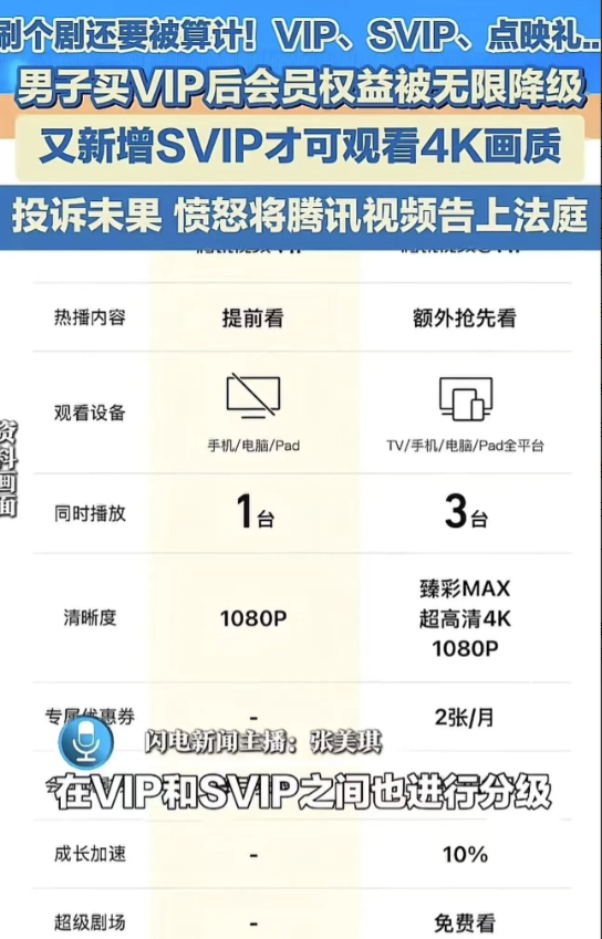终于有人站出来了!男子为了看视频,一口气开了好几年的腾讯会员vip,可是腾讯又新增了一个svip权益,本来VIP可以享受的权需要再花钱升级才能享受,这下男子忍不了,把腾讯视频告上了法庭!