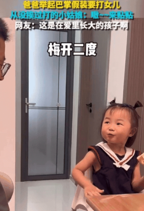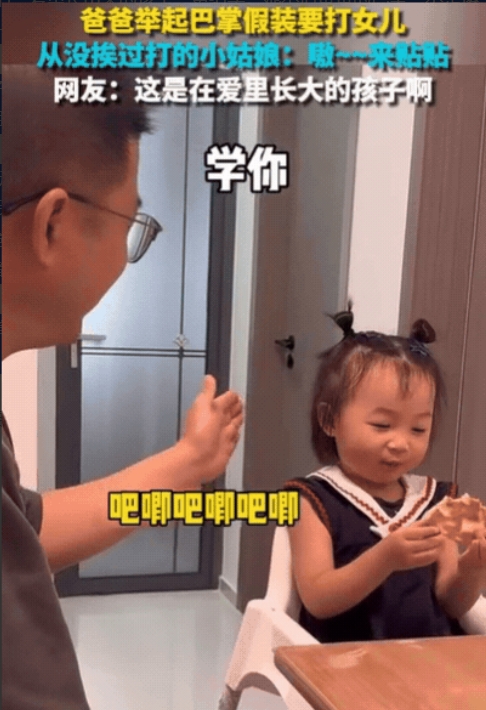 这是没挨过打的小孩,视频中,爸爸慢悠悠举起巴掌,小丫头非但没躲,反而咯咯笑着扑过来,举起肉乎乎的小手,往爸爸脸上拍了拍,掌心带着奶香味。