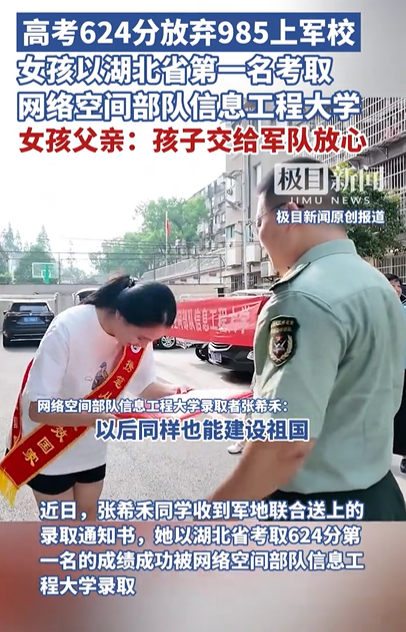 “格局打开了!”湖北荆州,女孩高考624分,主动放弃985,以湖北省第一名的成绩,考取了网络空间部队信息工程大学,女孩坦言:考一些985,211,虽然也能建设祖国,但我觉得考军校建设一下我们国家的网络空间,去保卫它的安全,是一件非常有意义的事情。女孩父亲:孩子交给军队放心! 据荆州新闻网7月20日报道,张希禾家里迎来了一群特殊的访客,身着军装的送通知书队伍。当烫金的录取通知书递到张希禾手中时,这个笑眼弯弯的姑娘,思绪仿佛又回到了填报志愿的那个夜晚。 高考成绩出来的那个晚上,张希禾考了624 分的好成绩,这个成绩让她成为了众人眼中的尖子生,985 院校的橄榄枝清晰可见。可她却在志愿表前,停下了动作。 在成绩没出来的那些日子里,她反复问自己:寒窗苦读十二年,究竟想奔赴怎样的人生?是走进知名高校,在繁华都市里探寻学术之路;还是换一种方式,为国家筑牢网络空间的 “护城河”? 网络空间部队信息工程大学的招生信息,让她注意到了。她想起那些关于网络安全的新闻,想起国家在数字化浪潮中面临的挑战,一个念头愈发清晰,上一个好的院校,固然能建设祖国,可要是能守护国家的网络空间,保卫它的安全,这件事更有独特的意义啊。 消息传开后,街坊邻居都忍不住议论。有人惋惜:“这么高的分,不去 985 太可惜。” 可张希禾的父亲,望着女儿眼里的坚定,只笑着说:“孩子交给军队,放心!” 这位父亲心里清楚,女儿选的不是一条轻松的路,却是一条能让青春绽放不一样光芒的路。 于是,她果断在志愿栏里,填上了这所军校的名字,以湖北省第一名的成绩,叩开了梦想的大门。在收到军校联合送来的通知书那天,张希禾身披绶带,站在阳光下。 她望着眼前整齐的军装,想起未来要钻研的网络空间防御和信息安全这些课程,眼神里满是憧憬。她知道,往后的日子,自己要和一群同样热血的伙伴,在军校里摸爬滚打,为国家的网络安全添砖加瓦。 张希禾即将踏入军校,开启全新的人生旅程。她会在晨跑的号声中迎接朝阳,会在实验室里为攻破网络难题绞尽脑汁,会在一次次演练中,把守护国家网络空间的使命,融进骨血里。 在这个人人都在说选择的时代,张希禾的故事,让我们看到另一种答案:青春的重量,不该只拿名校和高薪衡量,当个人的热爱与国家的需要同频共振,平凡的生命,也能选择不一样的光彩。就像网友说的那样,“不是所有人都得走同一条路,但总有人要去走那些守护的路,才有我们安稳的现在和未来”。 对于这件事,大家有什么想说的呢?欢迎在评论区分享。