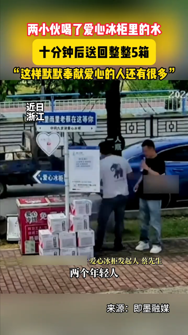 这就是格局!浙江,两男子口渴在路边免费供水点拿了两瓶水喝,当看到是为户外工作者供水的爱心冰柜后,两人没喝完水就迅速离开了,可没想到的是十分钟后两人开车又返了回来。爱心冰柜发起者:看到这样的爱心接力很感动 !