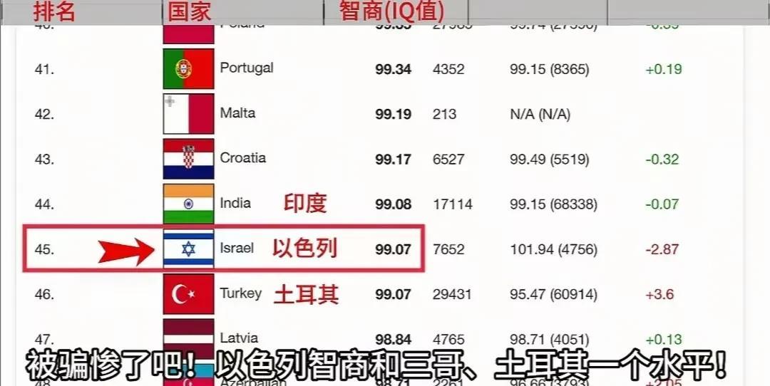 很有意思,全球平均智商排名,中国人稳居世界第一。 反观以色列犹太人的智商水平,与印度和土耳其为伍属于一个梯队! 西方人热衷各种排名,各种评选!不知道为何却不重视这个排行榜,估计智商这块儿,也确实没办法搞假!