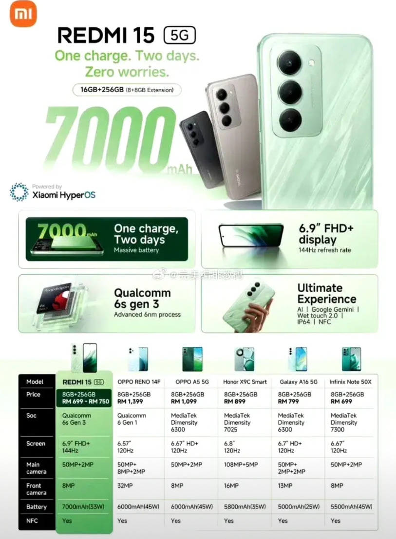 中端机新一轮的竞赛开始了 就在刚刚,红米Note15系列入网了 超大电池+90W快充+1.5K OLED直屏 50Mp大底主摄+50Mp直立小长焦, 满级防水,更强大的骁龙7系处理器! 王腾果然是大帝之相, 把红米带到了新的高度!