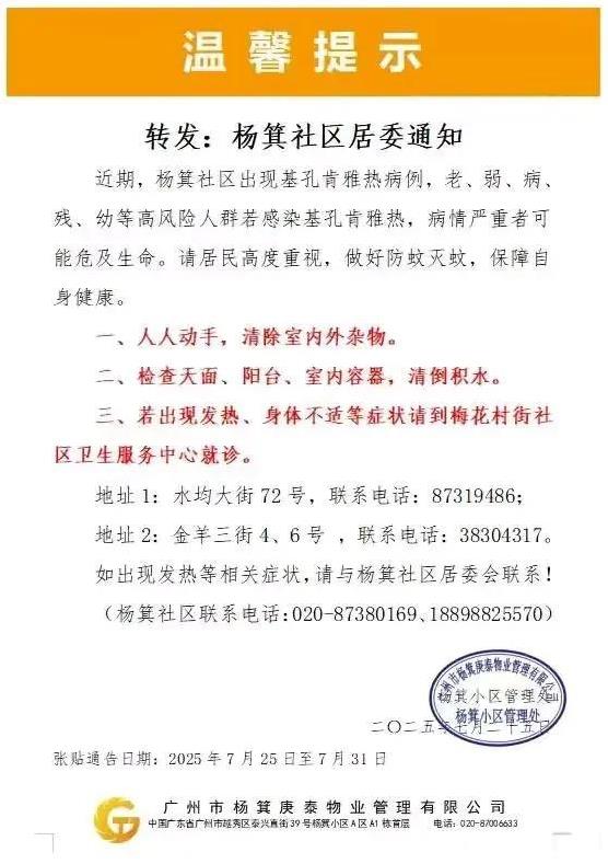 基孔肯雅病毒已经开始在广州流行了,各位广州的街坊要提高警惕了。 这个新的境外输入的病毒最终还是传到了广州。 笔者所在小区开始开展大规模灭蚊活动了。 而杨箕社区据说已经发现了病例。 与以往新冠病毒不同的是,此类病由蚊子传播,除了大规模杀灭蚊子之外,没有其他防护办法。 目前也无针对此类病症的疫苗与特效药。 虽然这个病症致死率并不高,但如果不及时治疗,就会造成长期的关节炎等慢性病,严重者甚至会丧失劳动力。 #基肯孔雅热疫情#