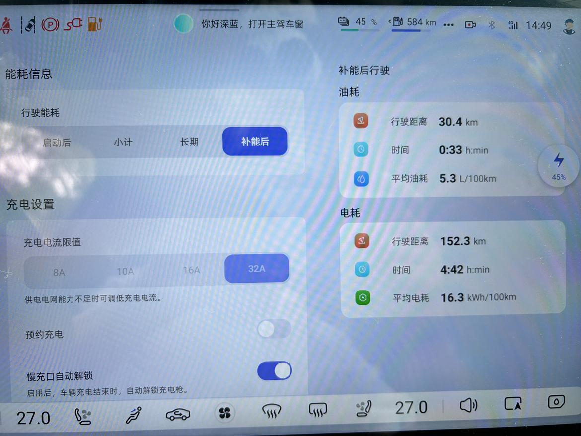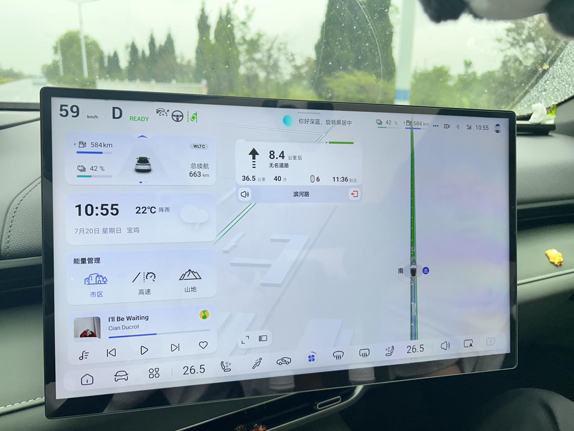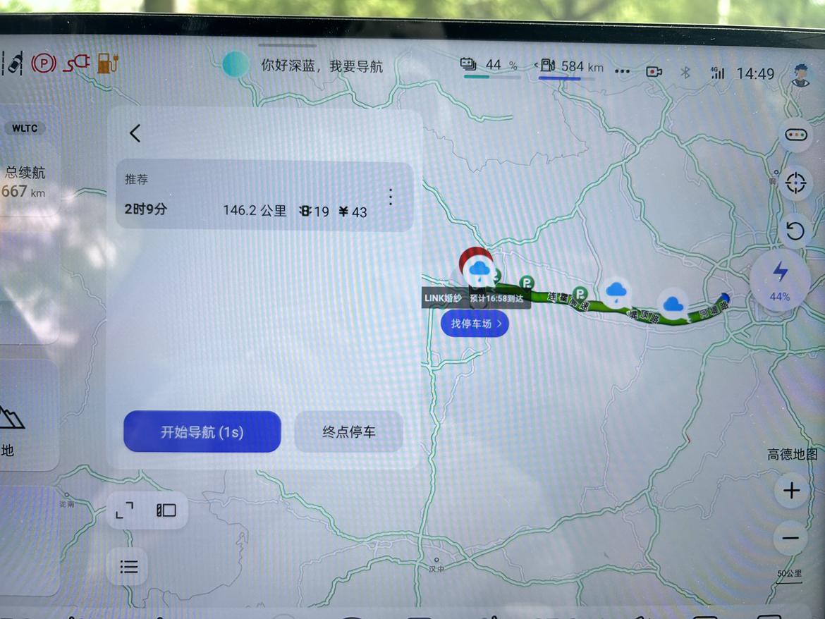 今天我开着深蓝S07 215max版本,从咸阳市出发前往宝鸡市,来了一场夏日出行。这次出行,我着重测试了它的电耗和满电续航情况,现在就给大家分享一下! 出发前,我在咸阳充满电。车子显示WLTC纯电续航是190公里 ,看着这个数字,我心里还是有点小期待,想看看实际能跑多少。 刚出发的时候,咸阳的天气是雨天 车内闷 我一上车就打开了空调,温度设定在26℃,风力1档,想着这样能舒舒服服地开启旅程。车子行驶在市区道路上,走走停停的情况比较多,但深蓝S07的动力响应很迅速,每次起步和加速都很顺畅。我用的是专属模式 动能回收设置为20% ,这样能最大保持舒适驾驶 上了高速之后,我把速度保持在110 - 120km/h左右。这个速度下,深蓝S07的稳定性非常好,底盘很扎实,方向盘也很稳,开起来特别有安全感。高速上的风景很不错,我一边欣赏着窗外的景色,一边留意着车子的电耗情况。 从咸阳到宝鸡,全程大概150公里左右。到达宝鸡的时候,我看了一下车子的电量,还剩下20%左右 。算下来,这次出行实际纯电行驶里程大概是152.3公里左右,和官方标称的WLTC纯电续航190公里相比,续航达成率差不多85折 。而且我全程开着空调,雨天阻力大 要是晴天的话,续航成绩应该会更出色。 在电耗方面,这次行程的平均电耗是16.3度/100公里 。我觉得这个电耗表现还是相当不错的,毕竟是在夏天开着空调,而且还跑了高速。要是在市区正常行驶,电耗应该还能更低一些。之前我在市区上下班通勤的时候,平均电耗基本能控制在14 - 15度/100公里左右。 深蓝S07 215max版本的续航和电耗表现真的让我很满意。这次从咸阳到宝鸡的夏日出行,它不仅让我享受到了舒适的驾驶体验,还展现出了出色的节能实力。无论是日常通勤还是短途旅行,它都完全能够胜任。如果你也在考虑入手一辆新能源汽车,深蓝S07 215max版本真的值得你考虑!