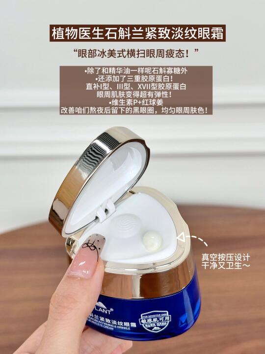 脸上大面问题解决了,眼睛上这些显疲态的纹纹路路也不能放过哈!✔植物医生石斛兰紧致淡纹眼霜无水配方,小小一瓶全是营养!•除了和精华油一样呢石斛寡糖外•还添加了三重胶原蛋白!直补I型、III型、XVII型胶原蛋白眼周肌肤变得超有弹性!•维生素P+红球姜改善咱们熬夜后留下的黑眼圈,均匀眼周肤色!
