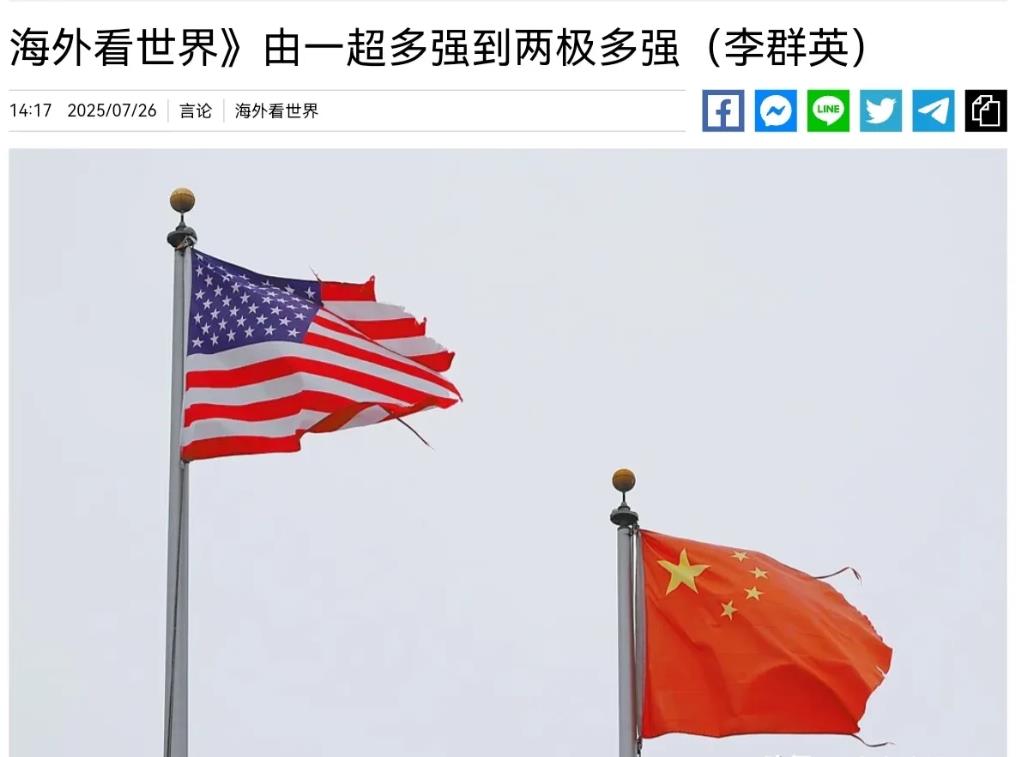 因此,岛内媒体认为,未来的世界不会是多极格局,而是中美两极多强的格局。对于岛内媒体的这一分析,我们怎么看呢?无疑,岛内媒体的判断是有道理的。用美国的话讲,我们目前是美国唯一和长期战略对手。这说明在美国的认知中,中美的竞争是全方位的,这某种程度也代表美国对于我们发展和实力的肯定。当然,我们的主张是致力于全球格局的多极化,但是仅从整体实力而言,尤其是在科技领域,中美确实越来越成为唯二的竞争对手。