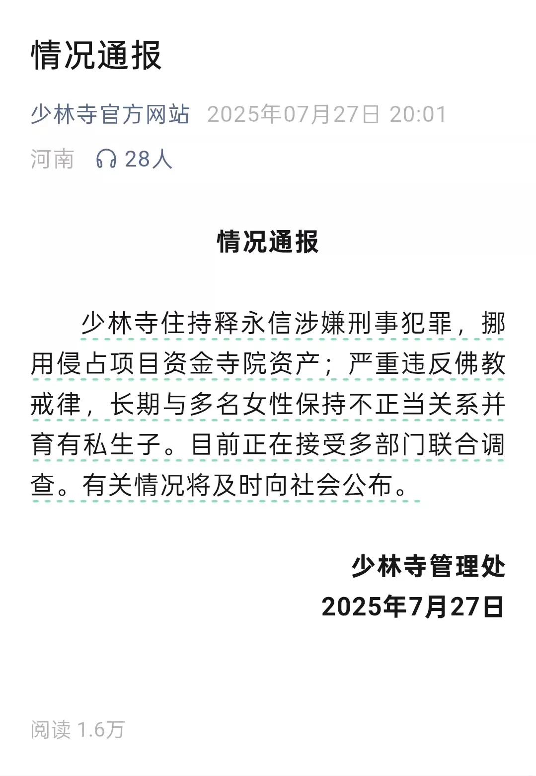 官方通报,传言成真!少林寺方丈释永信被查,该来的还是来了! 释永信作为少林寺的住持,相当于寺庙里的“一把手”,本该严守佛门五大戒律——尤其是“不近女色”、“不贪财”这些基本规矩。但根据官方通报,他不仅涉嫌挪用公款、侵占寺庙资产,还长期和多名女性保持不正当关系,甚至还生了私生子。这哪里像个出家人?简直把世俗的欲望和利益算计玩得比普通人还溜。 更讽刺的是,他一边穿着袈裟当网红方丈,每天发微博吸引粉丝关注;另一边却背着香客们的捐款干这些事。很多网友气得都说:“这是拿我们的香火钱养女人生孩子?”还有人调侃:“他脱下袈裟跟俗人有啥两样”? 如今他被多部门联合调查,也算给佛教界敲响了警钟——佛门不是法外之地,披着僧袍也得遵守法律和道德底线。 这件事让大家看清两点:一是宗教场所的管理必须透明化,不能成了某些人谋私的工具;二是宗教名人更应以身作则,别把信徒的信任当成任性妄为的资本。既然选择了修行这条路,就得真修,而不是借着名号到处捞好处,干一些见不得人的勾当!