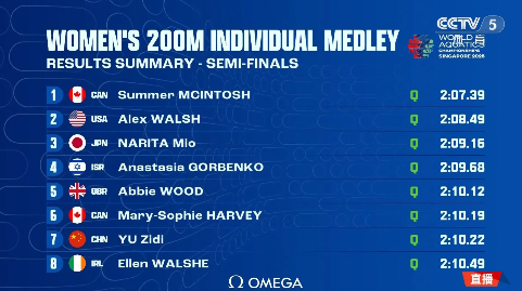 在女子200米混合泳的半决赛中,于子迪一度在淘汰的边缘,最后50米自由泳奋起直追,终于以2:10.22第五个到边,惊险的以半决赛第七名的成绩成功拿到了明天的决赛权。