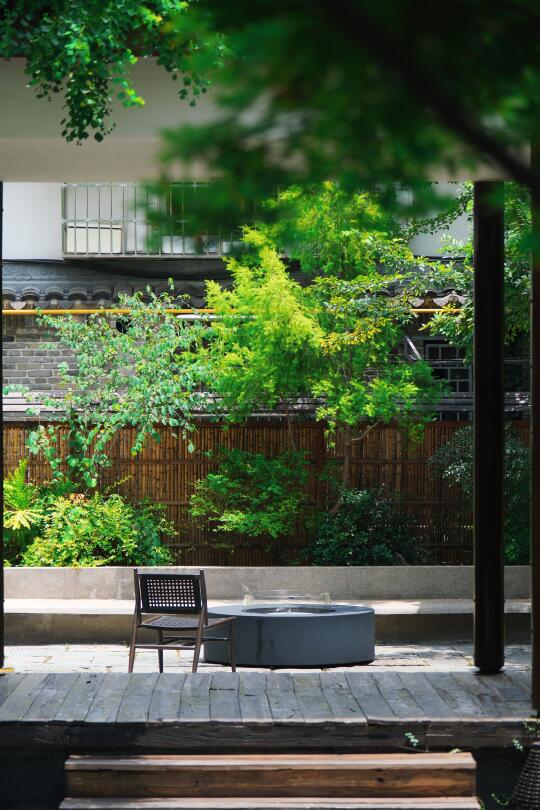 🍃最喜欢的是酒店的庭院,穿过巷子里的市井烟火,推开木门瞬间安静。竹林+青石板+灰瓦墙 组合的庭院,绿意扑面而来,超级治愈。坐在廊下喝免费下午茶,听竹叶沙沙响,车流声神奇消失。