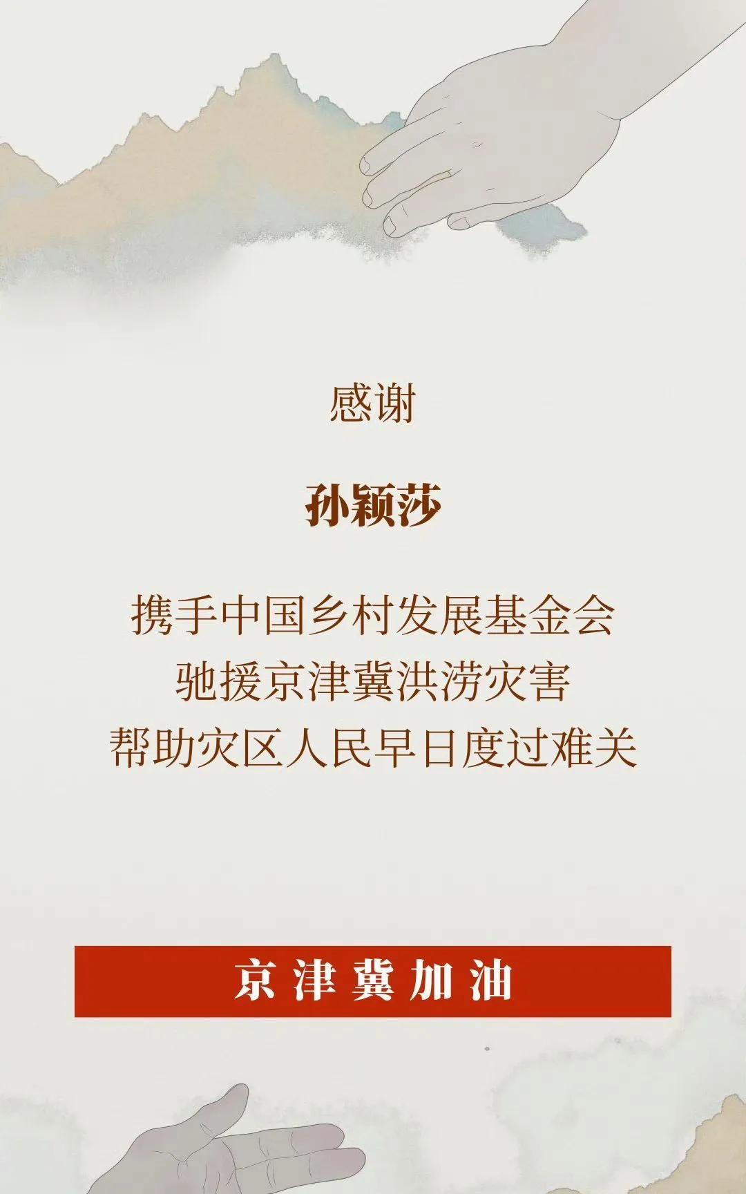 心中有大爱,行胜于言的孙颖莎!孙颖莎心系家乡灾情,驰援京津冀洪涝灾区,助力灾区救援和重建。 中国乡村发展基金会发文感谢孙颖莎对灾情的持续关注,并捐赠物资,驰援京津冀洪涝灾害。 孙颖莎好孩子,场内为国争光,场外温暖传递。 点赞正能量[赞]明媚小莎照亮每一个潮湿的角落,让我们和孙颖莎一起传递温暖,愿爱心如星火燎原,温暖每一颗心。愿灾区人民早日度过难关!