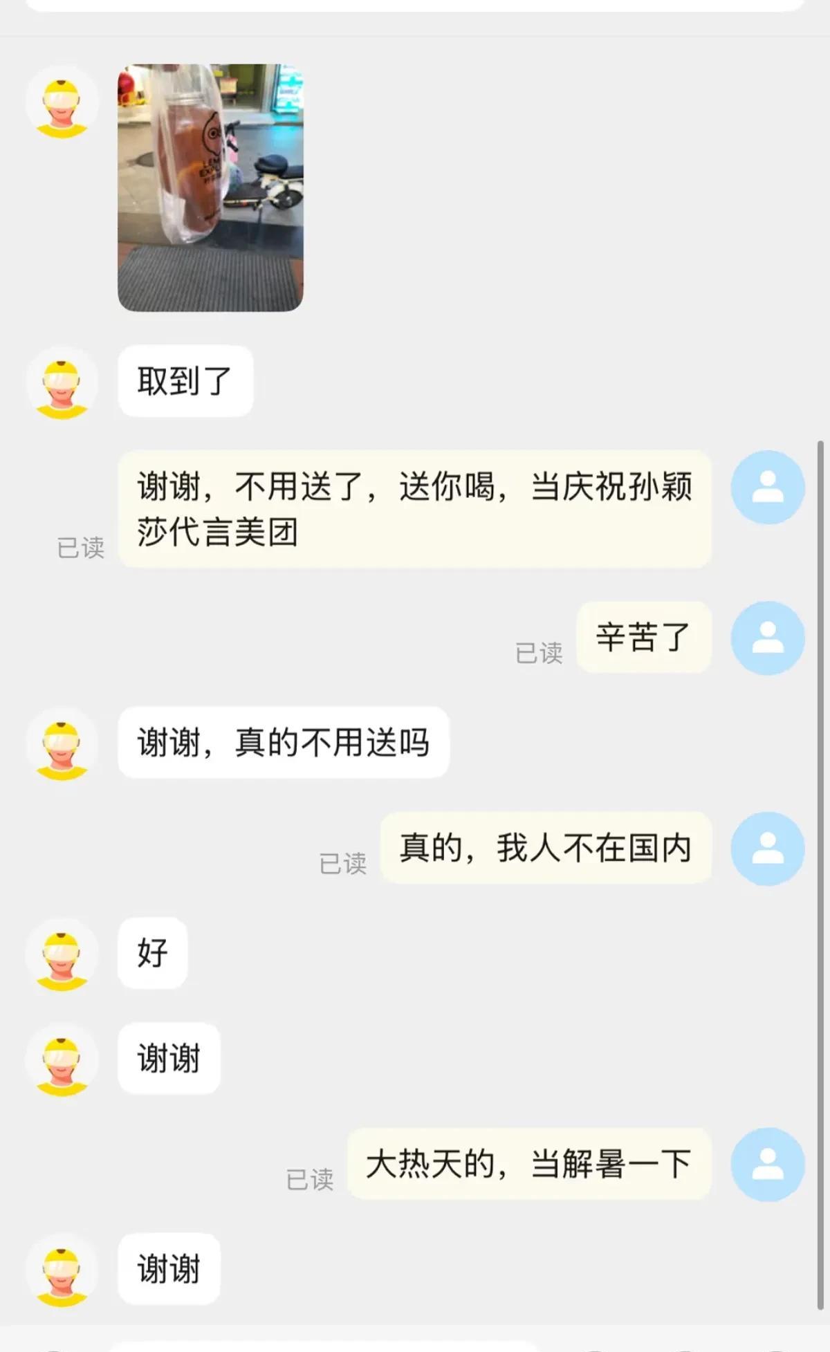 又是感动的一天,太美好了!孙颖莎球迷们为了支持孙颖莎代言美团,自发点美团外卖送骑手! 孙颖莎成为美团美味生活的代言人的第一天,她的许多球迷自发通过美团点单送骑手小哥,在炎炎夏日为骑手送上了一份关爱。 外卖订单温馨留言: “饮料是给你点的,我是为了支持孙颖莎下单的,祝福努力工作的你事事顺心。” “不用送过来,请你喝。今天是孙颖莎代言美团,我点这个支持她” “球迷庆祝孙颖莎成为美团代言人。这杯饮料请你喝了,辛苦了” 骑手感动回应: “中国乒乓球牛逼,孙颖莎牛逼!” “真的吗?非常感谢” “太感动了” “哪里来的女菩萨” “从现在开始,我也是孙颖莎的球迷了,回学校给您宣传宣传,发扬光大” 美团外卖骑手纷纷来到孙颖莎评论区,表达感谢: “此时此刻你的球迷温暖了我 希望你们都越来越好[耶]” “今日快乐是莎莎的粉丝给的[呲牙]” 太棒了,共同传递正能量!球迷们追逐太阳的同时,也在散发着他们的阳光!