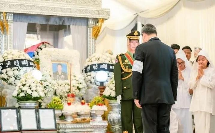 柬埔寨首相洪玛奈出席在柬泰冲突中遭炮击身亡的陆军第七师师长杜昂·索姆尼昂少将葬礼。 ???
