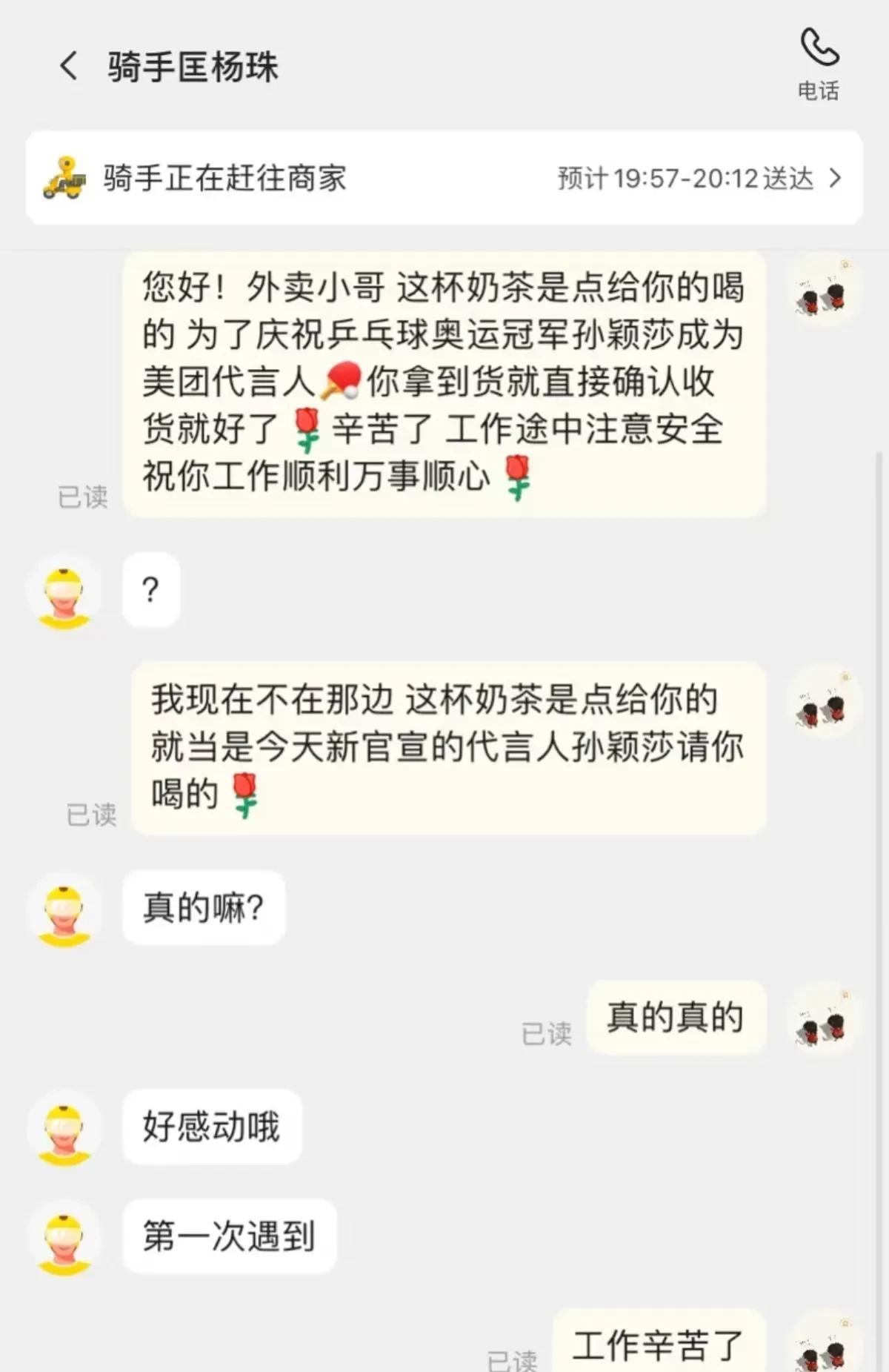 感动,太美好了!美团骑手疯狂被投喂的一天。 孙颖莎成为美团美味生活的代言人的第一天,孙颖莎球迷们为了支持孙颖莎代言美团,自发通过美团点单送骑手小哥,在炎炎夏日为骑手送上了一份关爱。 外卖订单温馨留言: “饮料是给你点的,我是为了支持孙颖莎下单的,祝福努力工作的你事事顺心。” “不用送过来,请你喝。今天是孙颖莎代言美团,我点这个支持她” “球迷庆祝孙颖莎成为美团代言人。这杯饮料请你喝了,辛苦了” 骑手感动回应: “中国乒乓球牛逼,孙颖莎牛逼!” “真的吗?非常感谢” “太感动了” “哪里来的女菩萨” “从现在开始,我也是孙颖莎的球迷了,回学校给您宣传宣传,发扬光大” 美团外卖骑手纷纷来到孙颖莎评论区,表达感谢: “此时此刻你的球迷温暖了我 希望你们都越来越好[耶]” “今日快乐是莎莎的粉丝给的[呲牙]” 太棒了,共同传递正能量!球迷们追逐太阳的同时,也在散发着他们的阳光! #美团官宣孙颖莎成为其代言人#