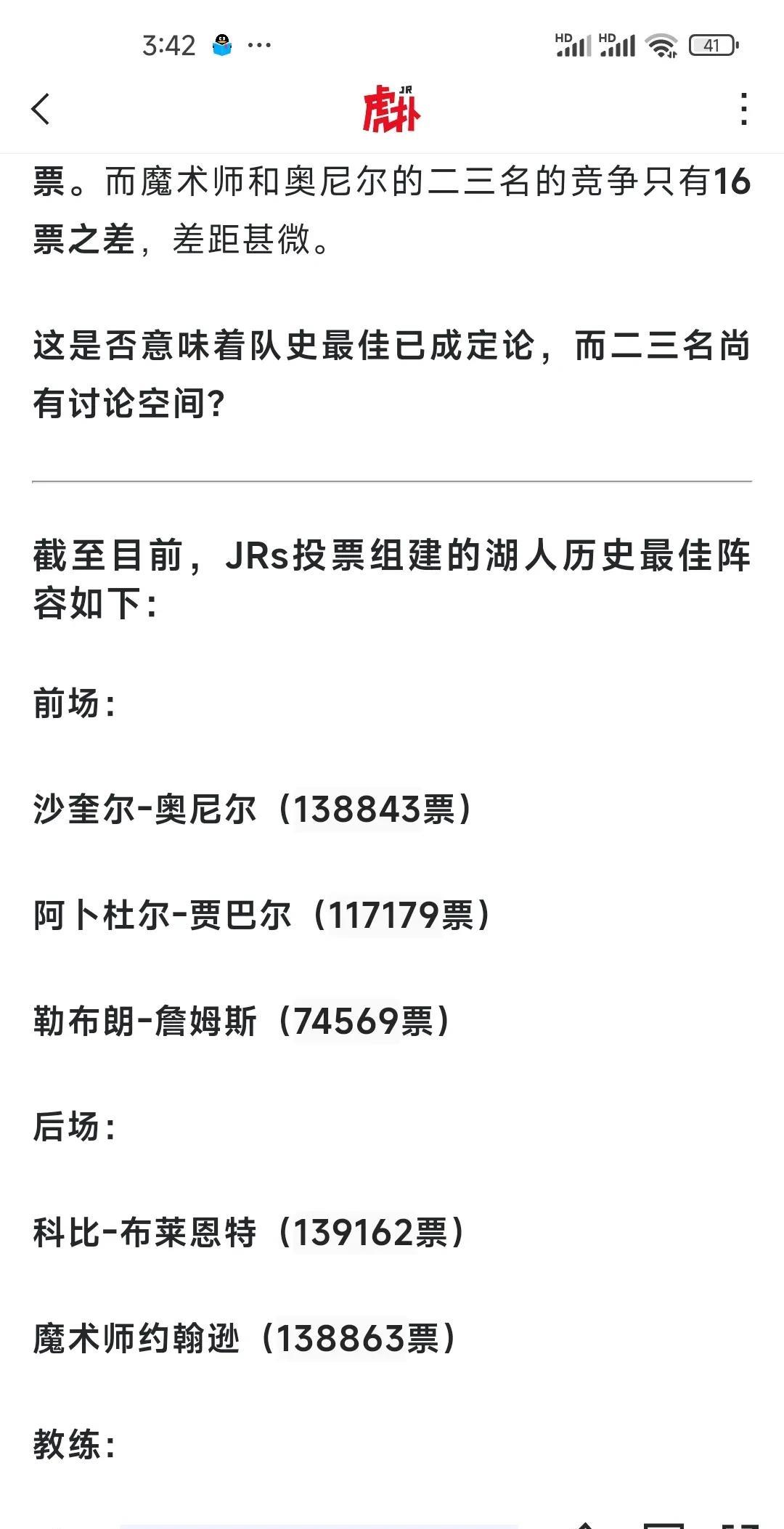 #头号创作者激励计划#虎扑评选的湖人队史最佳球员,詹姆斯票数差距甚远! 科比以139653票封顶今日湖人最佳历史最佳球员! 魔术师约翰逊139354票位列第二,奥尼尔139338位列第三! 三人票数相差不多! 而詹姆斯拿到了74569张评选票数! 不过,詹姆斯没出现在这里一点也不奇怪 奥尼尔和科比在湖人队建立了王朝! 科比更是一生都在湖人度过! 魔术师更是湖人队传奇人物,帮助湖人五次获得总冠军! 詹姆斯虽然伟大,但是就湖人队史来说,他跟他们三位还没办法比的!