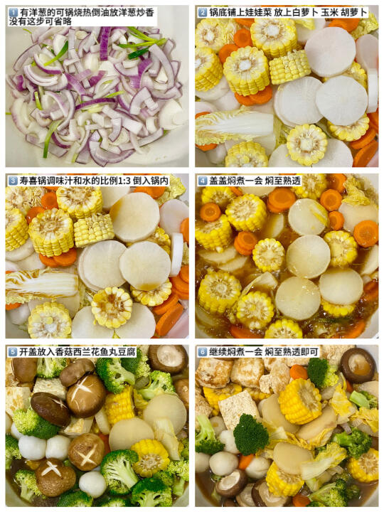 2️⃣ 家里有洋葱的可锅烧热倒油倒入洋葱炒香 没有可省略 锅底铺上娃娃菜 放上白萝卜玉米胡萝卜 寿喜锅调味汁和水比例1:3倒入锅内 盖盖焖煮一会 焖至熟透 开盖放入香菇西兰花鱼丸豆腐 继续焖煮一会 焖至熟透即可