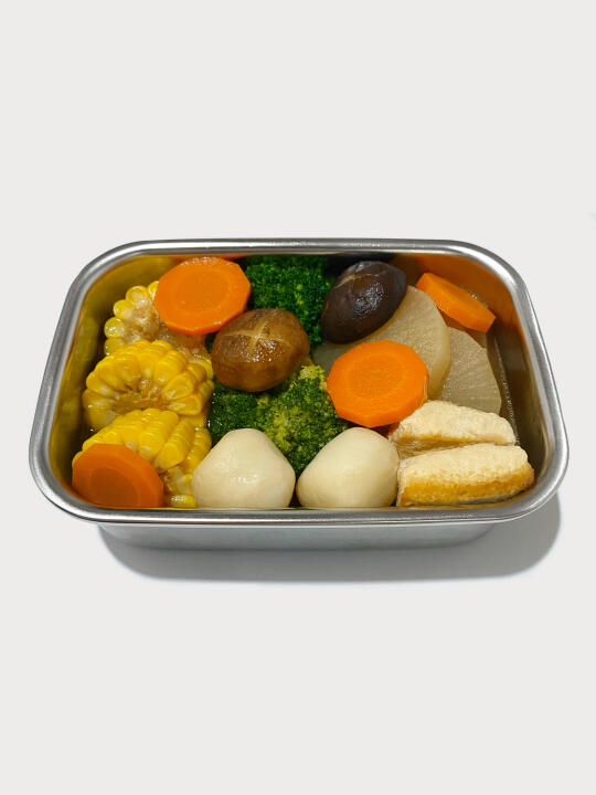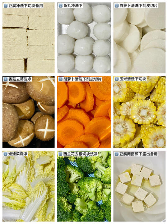1️⃣ 豆腐冲洗下切块备用 鱼丸冲洗下备用 白萝卜清洗下削皮切片 香菇去蒂洗净 胡萝卜清洗下削皮切片 玉米清洗下切块 娃娃菜洗净 西兰花去根切块洗净 豆腐两面煎下盛出备用