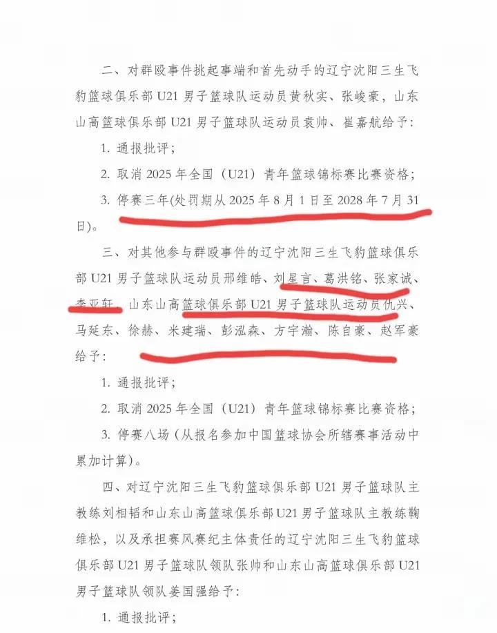 中国篮协顶格处罚辽宁男篮U21和山东U21冲突球员,冲突球员张峻豪、黄秋实还有山