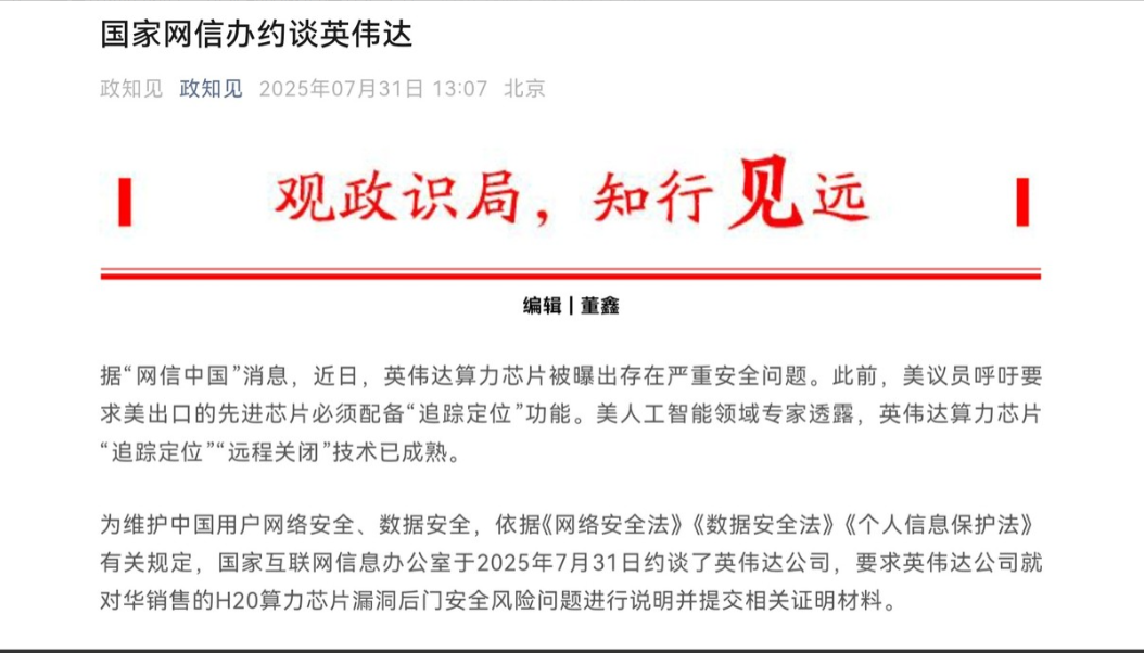 美国至今认不清形势,要在出口中国的芯片里安后门;中方不惯着他们,英伟达被约谈!