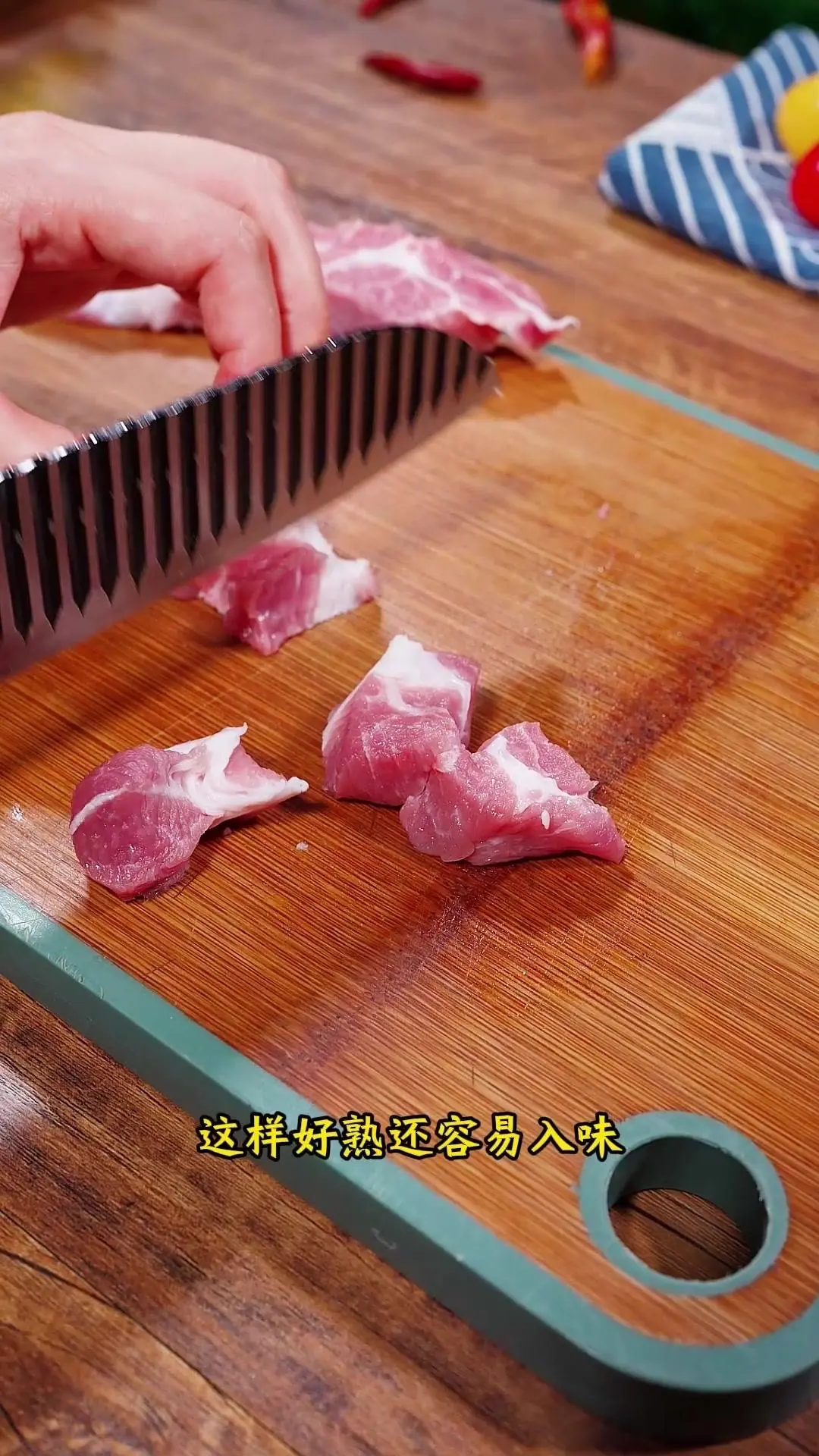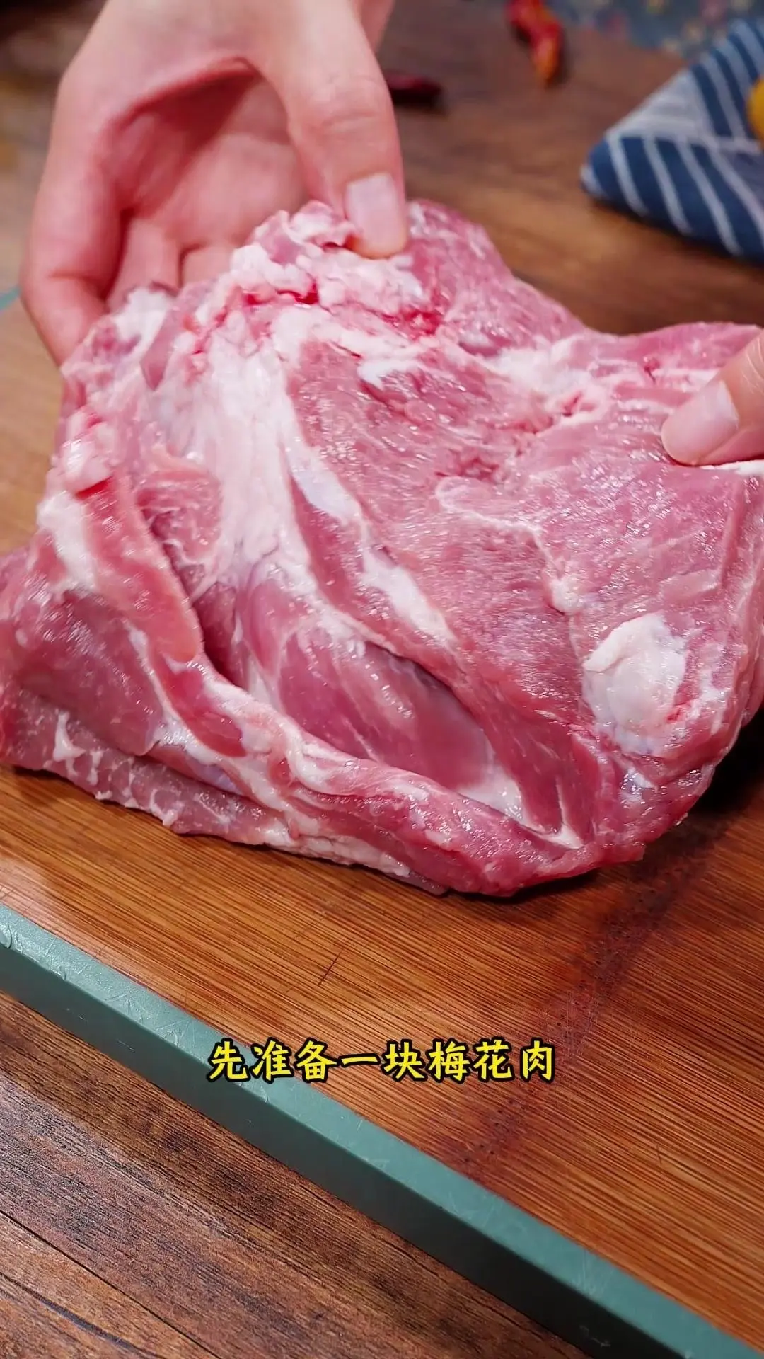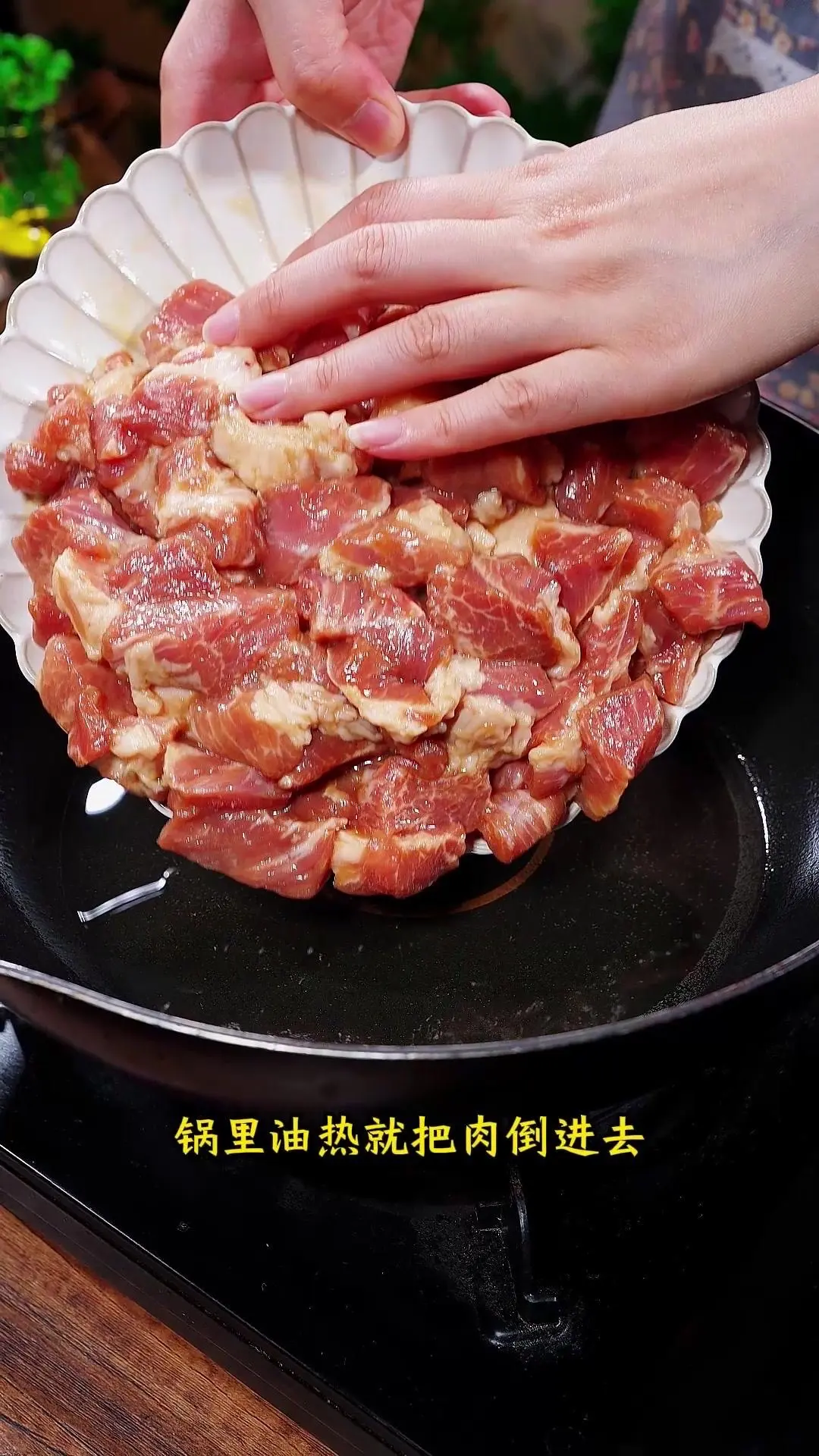 1️⃣一块梅花肉切成小块,好熟还容易入味,配上四季豆,维生素和膳食纤维都够。