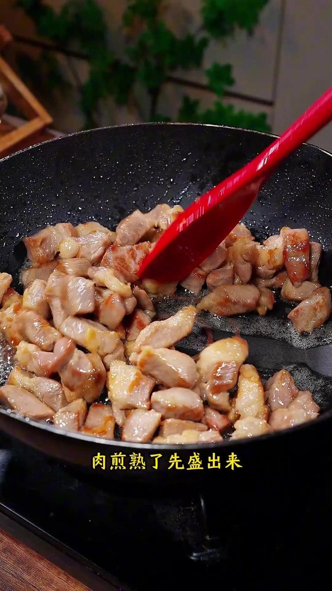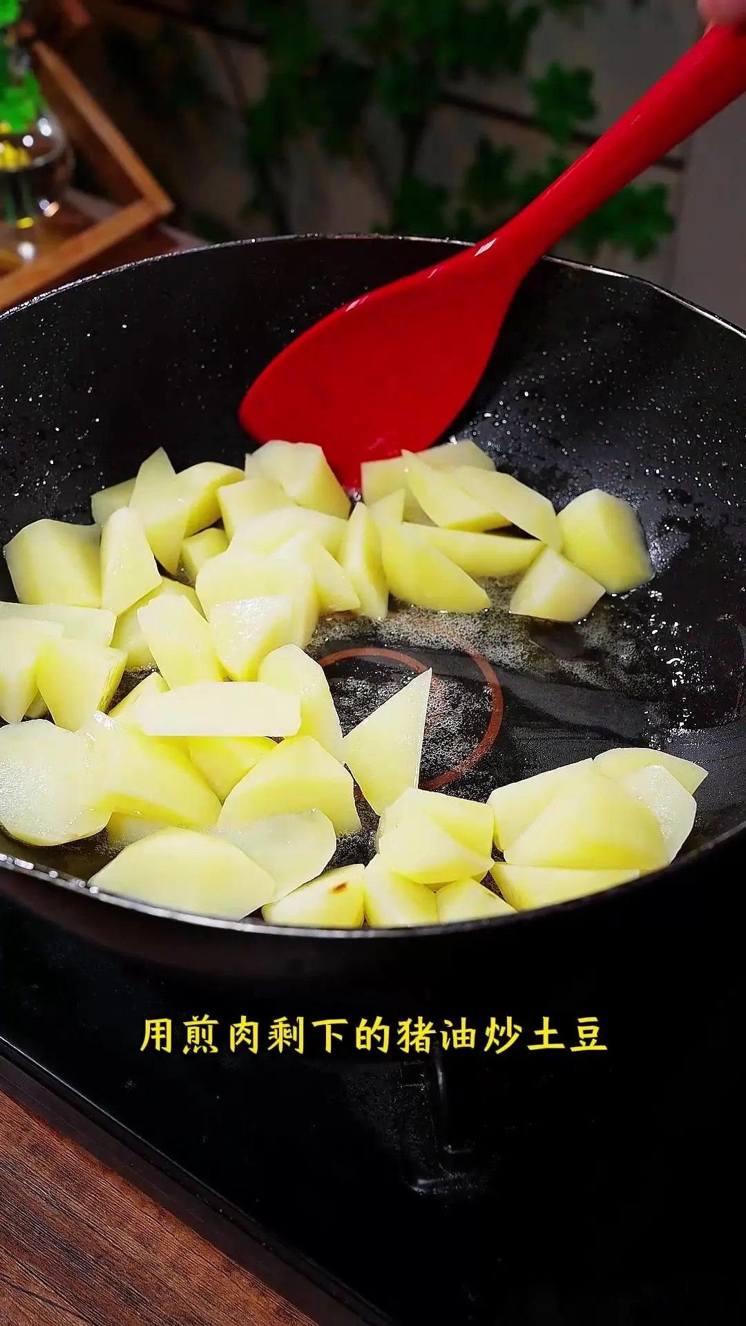 5️⃣锅里油热,倒肉,小火慢慢煎,肉煎熟盛出来,不用洗锅,直接倒土豆,用煎肉剩下的猪油炒土豆,香到不行,炒到土豆八面焦黄。