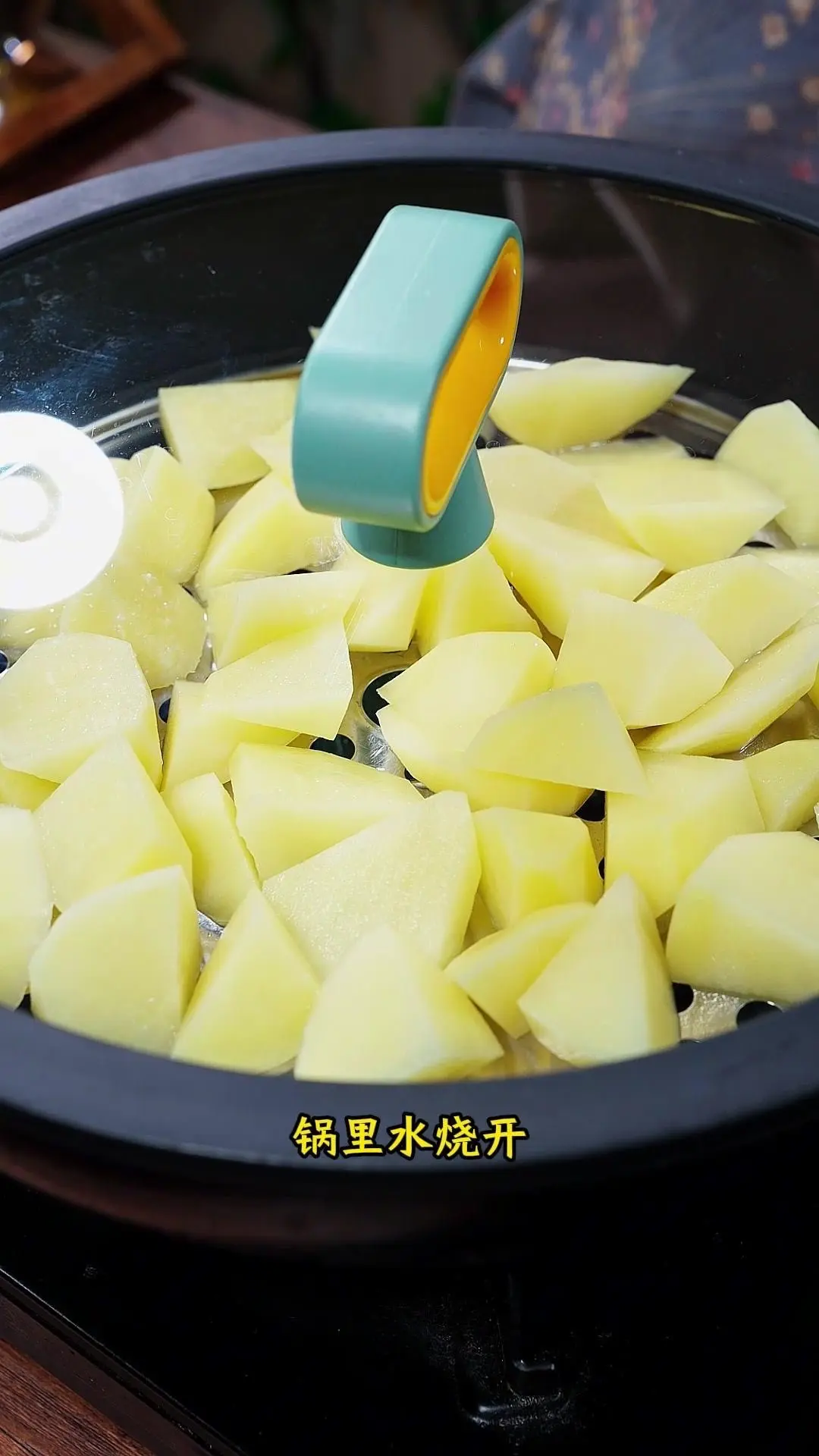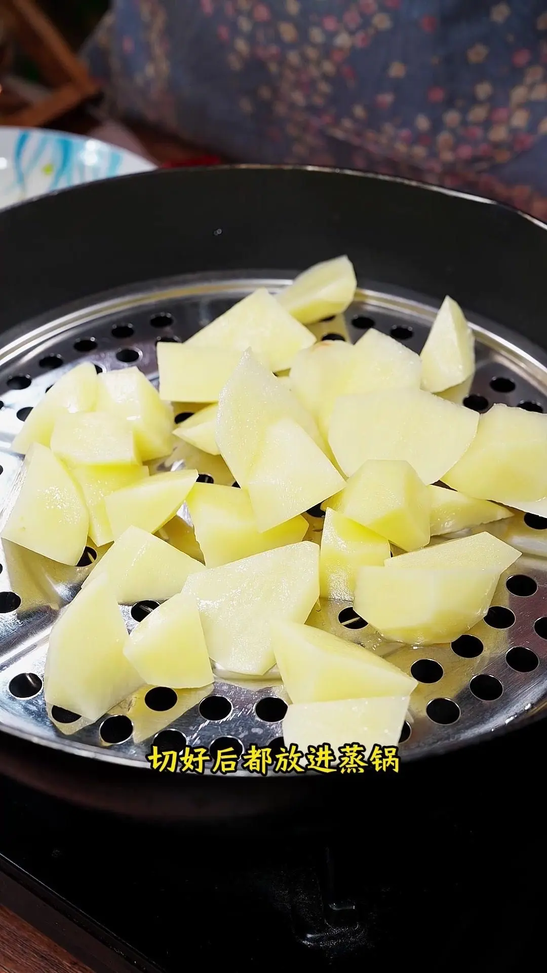 2️⃣把0.3元一斤的黄金小土豆去皮切块,切好后放进蒸锅,开大火蒸8分钟。
