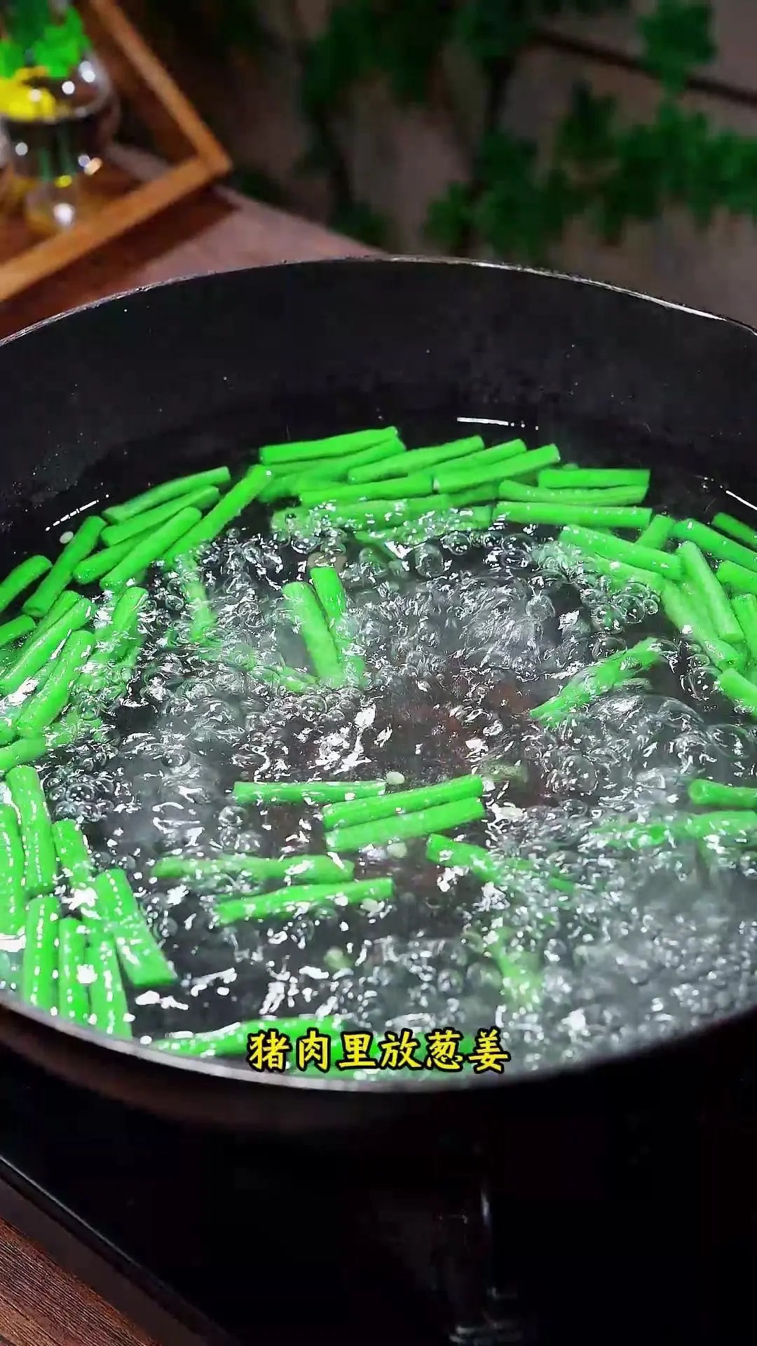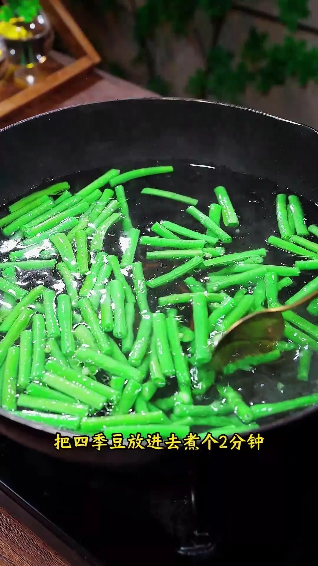 3️⃣锅里水烧开,放一勺盐,给四季豆提前入味,加点食用油,保持翠绿不变色,把四季豆放进去煮2分钟,煮熟捞出。