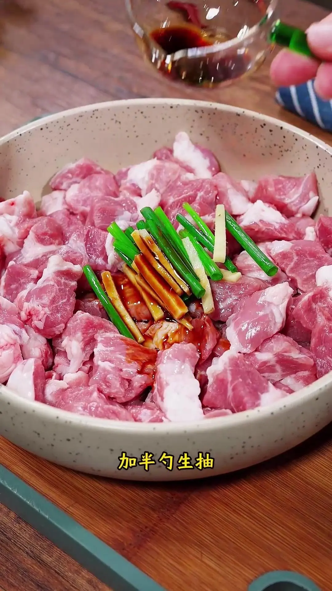 4️⃣猪肉里放葱、姜,倒点料酒去腥,加半勺生抽、适量蚝油,抓匀腌10分钟。