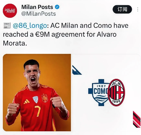 米兰与科莫俱乐部达成一致!我是没看懂这个达成一致到底是啥意思,金额是900万欧元,之前一直都说的是莫拉塔转会费为1500万欧元,这里面的600万欧元是不是土耳其加拉塔萨雷俱乐部那600万欧元租借费。