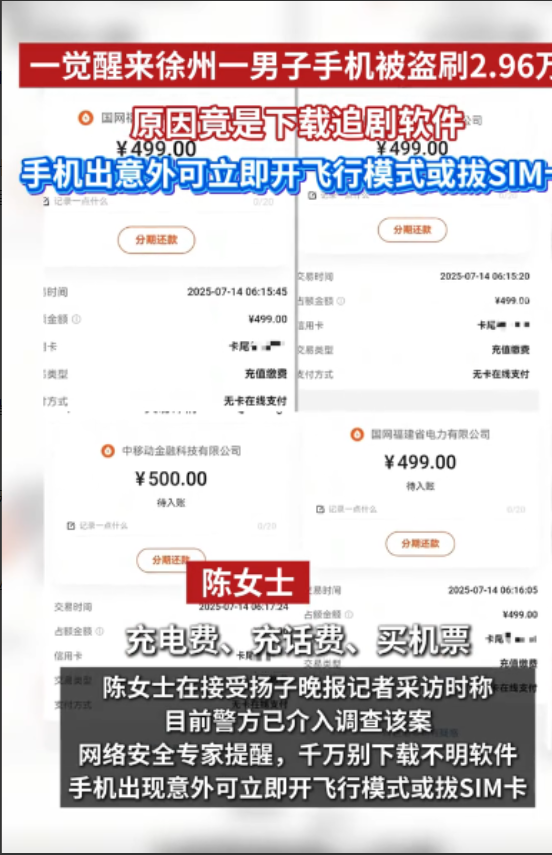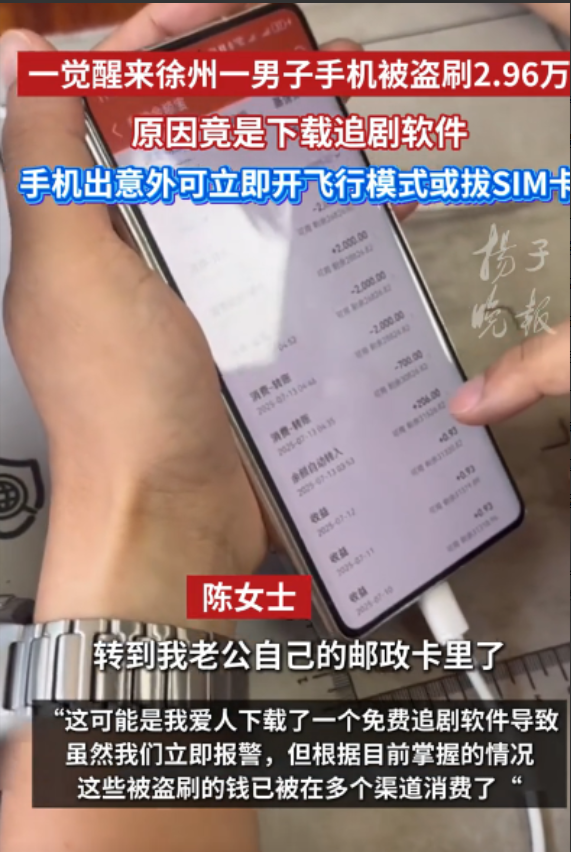 “太吓人了!”江苏徐州,一男子睡醒后,发现自己手机掉电特别快,点开一看,竟然发现自己手机里的钱全都没有了,当调取转账记录一看,手机上绑定的支付系统,一共被盗刷29600元,吓得男子赶紧关机,没曾想,根本没有关系,甚至还出现了闪退的情况,随后男子报警,这才得知了被盗刷的原因。