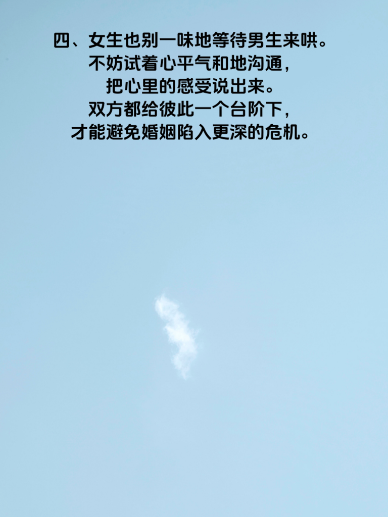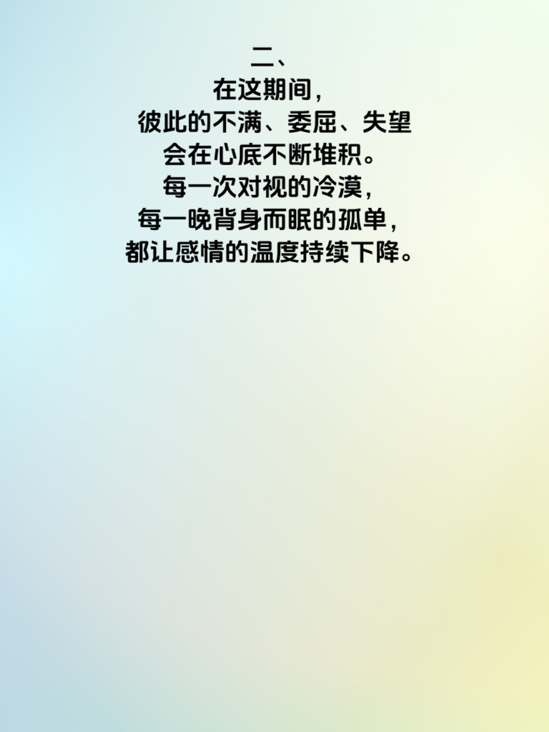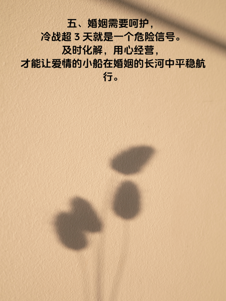 一、婚姻冷战超 3 天,往往意味着情感裂痕在悄然扩大。冷战初期,双方或许只是想各自冷静,可一旦超过三天,沉默就成了伤人的利器。 二、在这期间,彼此的不满、委屈、失望会在心底不断堆积。每一次对视的冷漠,每一晚背身而眠的孤单,都让感情的温度持续下降。 三、要知道,冷战无法解决问题,只会让矛盾越积越深。男生此时应主动打破僵局,不要觉得道歉就是丢面子。真诚地表达自己的想法,告诉她你在乎她,不想因为冷战失去她。 四、女生也别一味地等待男生来哄。不妨试着心平气和地沟通,把心里的感受说出来。双方都给彼此一个台阶下,才能避免婚姻陷入更深的危机。 五、婚姻需要呵护,冷战超 3 天就是一个危险信号。及时化解,用心经营,才能让爱情的小船在婚姻的长河中平稳航行。