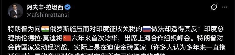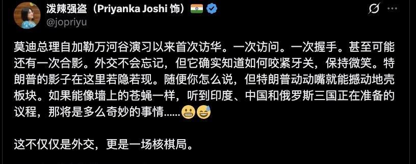 小心别被莫迪给忽悠了! 印度高调官宣总理莫迪月底来中国访问了。消息一出,印度三哥三姐在外网集体狂欢了。因为特朗普对印度的极限施压把印度推向中国和俄罗斯的怀抱,把印度推向美国敌人的怀里对美国自然没啥好处。更令人作呕的是,在三哥们的想象中,中国、俄罗斯、印度将聚集在一起应对美国的重拳。 要知道的是,莫迪6年来首次访华,只是来参加上合峰会,并非国事访问,更不是印度在被美国针对后的一次刻意安排。它只是一次例行公事,何况他头一天来第二天峰会结束就离开。因此根本就谈不上什么是对中国的“刻意讨好”,更谈不上“倒向中国”。国人对印度不要有所期待。 印度既然不是痛改前非,真心要与中国进行龙象共舞,那我们就要警惕,别被印度所利用和欺骗。因为当前特朗普虽然对印度威胁逐步加大,只是想从印度身上啃下更多的实惠。但美印还没有放弃关税谈判,美国代表团在本月还要去印度进行沟通谈判。因此印度高调莫迪访华,实际上也是有意对冲美国对印度的高调威胁,提高印度的关税谈判筹码。因此印度人利用中国的成分更大一些。这是印度人一贯的投机心理。我们要把眼界睁大一些。 要说有没有好处,有一点倒是值得说一下。被美国打了一拳后,印度有可能会醒悟过来。美国是吃人不吐骨头的主,印度也要有制衡美国的手段。过去在金砖国家中,尤其是在美元替代货币方面,印度成为阻碍金砖货币推进的那位,印度人想以此来讨好美国。 但现在这种情况可能会改变,至少在短期内会改变。特朗普的关税战给了金砖国家强大的动力,促使它们合作开发替代性的国际支付体系——金砖国家共同货币。印度人不要再阻碍这个议程了,要学会对抗美国,这样才有牌可打。而不是像如今这样,一边倒被美国人追着打、啃骨头。#印度总理莫迪# #特朗普提高关税能吓住印度吗# #莫迪在美印贸易谈判中面临哪些压力#