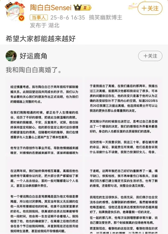 双方从相濡以沫的亲密爱人到心生距离的假性伴侣,可以说男方变了,变得专注事业扩张不顾女方情绪,也可以说,压根没有变,陶白白从素人走红至今,就不可能放下对事业的执着转向“老婆孩子热炕头”。[叹气R]