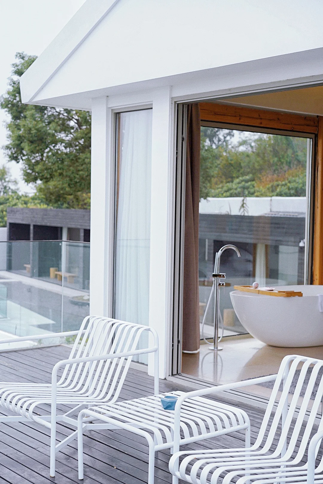 浴缸正对湖面,泡澡、赏景、听风三件事一次完成。