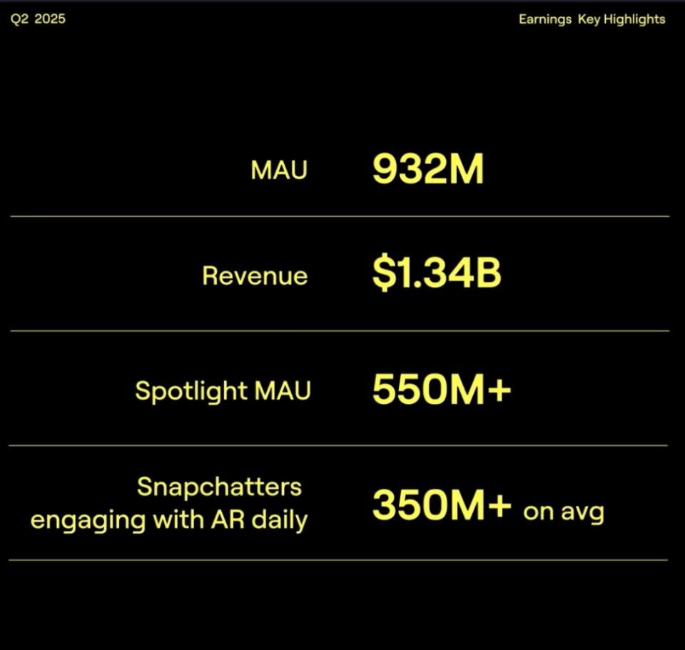 03 Snap公布2025年第二季度财报:全球月活用户增长至9.32亿,付费订阅用户增长推动营收多元化 8月6日,Snap发布 2025 年第二季度财报。报告显示,公司旗下视觉通讯应用 Snapchat 用户规模持续增长,全球月活用户 (MAU) 达到 9.32 亿,朝着全球 10 亿月活用户的目标稳步迈进;日活用户 (DAU) 达到 4.69 亿,同比增长 9%。得益于中小广告客户数量的持续增长及效果广告的稳健表现,公司第二季度营收达 13.45 亿美元,同比增长 9%。 Snap 联合创始人兼首席执行官 Evan Spiegel 表示,“在第二季度,公司在 AI 与 AR 领域持续投入,帮助我们的全球用户规模持续增长,月活跃用户已达 9.32 亿。随着用户规模和转化率的双重提升,尤其是 Sponsored Snaps 产品的广泛上线,我们非常期待借助广告主投放表现的提升,实现营收增长加速。”