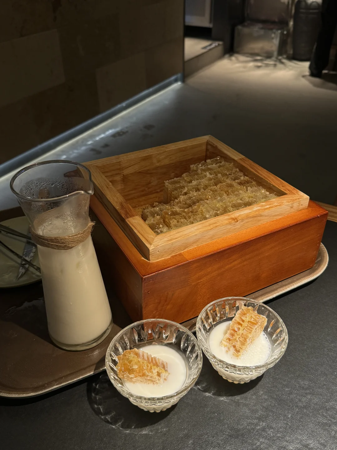 端上来直接惊到!整盒蜂巢摆在面前 挖一大块放进乳白色米酒里 清甜带着淡淡花香 像我这种不会喝酒的都连干3️⃣杯!