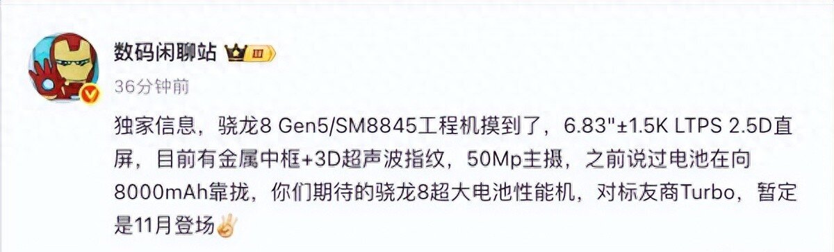 此次曝光的相关信息显示,这款或将搭载骁龙8 Gen5/SM8845的新机工程机采用了一块具备1.5K分辨率的6.83英寸LTPS 2.5D直屏,并用上金属中框和3D超声波指纹识别模块,电池容量有望接近8000mAh。而在影像方面,所配备的则可能是5000万像素主摄。