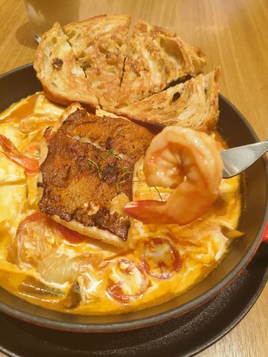 有鱼有虾仁,有菇类和疏菜,富含蛋白质,微酸辣,开胃提神