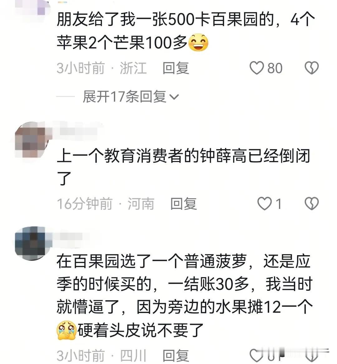 “我们是在教育消费者成熟!” 近日,有网友吐槽百果园里面的水果太贵了,称“月薪2万吃不起”,随便买买就一百元了引发网友热议。 对此,百果园董事长回应:我们是在教育消费者成熟,百果园几千万的会员,如果没有一批真正认识到百果园价值的顾客,那百果园也就不复存在。 余惠勇还提到:“我认为商业就两种第一个利用消费者的无知,第二个教育消费者成熟,像百果园这么多年来都走在一个教育消费者成熟的路上” 百果园的客户也是有福了,能被董事长亲自教育。上一个敢这么说的是卖雪糕的,如今其子公司已经申请破产了。 百果园去年年初计划十年内线下门店超万家,而现实是平均每天关店近5家。 要我说路边的水果摊性价比也很高呀,可有网友说店里的水果质量更好,那只能说这就是个人选择了。 这些东西都是明码标价的,价格就在那里摆着,外面的水果摊有便宜的也很好吃啊,店里贵的水果可能有贵的道理吧,还是消费群体不同。 有网友说在百果园买两个哈密瓜87块钱,被公司同事嘲笑至今。 还有网友说自己之前在百果园买六个桃64块,想要退被拦住了。 对这件事您怎么看呢?欢迎表达您的观点。