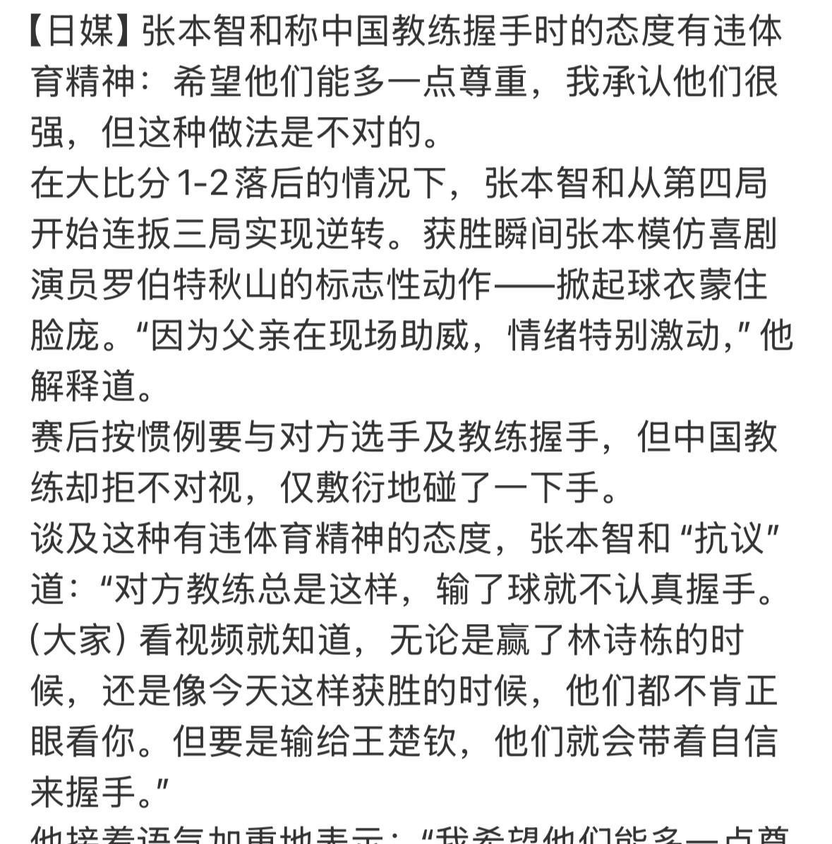 张本智和这个话唠,向全世界开炮:中国教练王皓总是这样,我赢林诗栋向鹏,他都不认真握手,我输王楚钦,他马上带着自信,来握手。 张本智和对王皓的不满由来已久,这也不奇怪。因为王皓在中国由于雷霆暴怒,陷入场外双标争议,对林诗栋态度是否过于严苛,100%是发生在他输给张本智和场外。 张本智和由此被瞪得毛骨悚然,头皮发麻,转过去看到了一张真正意义上的红温面孔。 在你最快乐的时刻,你赢下了比赛,接着你要去给对方场外教练提供情绪价值,这对张本智和来说,也是种折磨。 他过去的时候,每次王皓都是一张黑透的脸,眼神也从不正眼看他,握手最多沾染了两秒,立马甩开,绝不认真握手。 但每次张本智和输给王楚钦以后,王皓就会带着自信,以坚定的眼神、冲过来热情地和他握手。 但是从赛场礼仪来说,起码的风度还是要拥有的。 以日本队的场外教练来说,哪怕是面对张本智和决赛0:4溃不成军,在主场福冈惨败王楚钦的赛况,他也耐心地等待王楚钦享受完自己的获胜时刻,给予最温暖的微笑,感谢双方都打出了精彩的比赛。 张本智和疑惑不解,我承认他们真的很强,但是能不能多点尊重呢。这样是非常不对的。