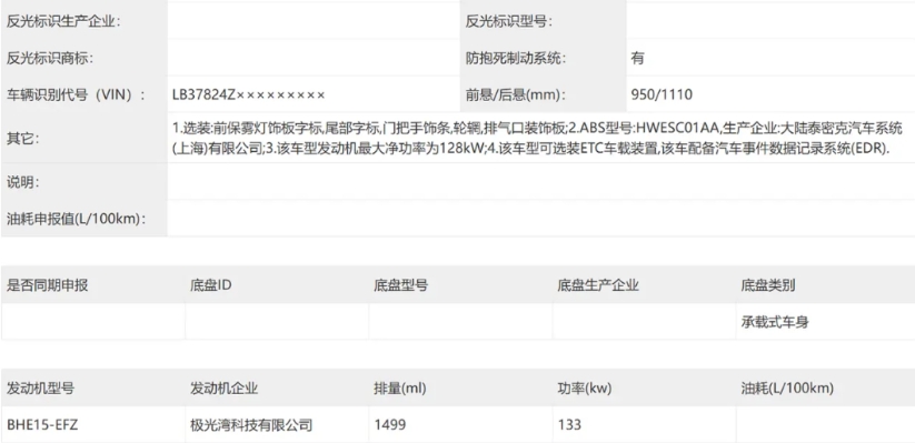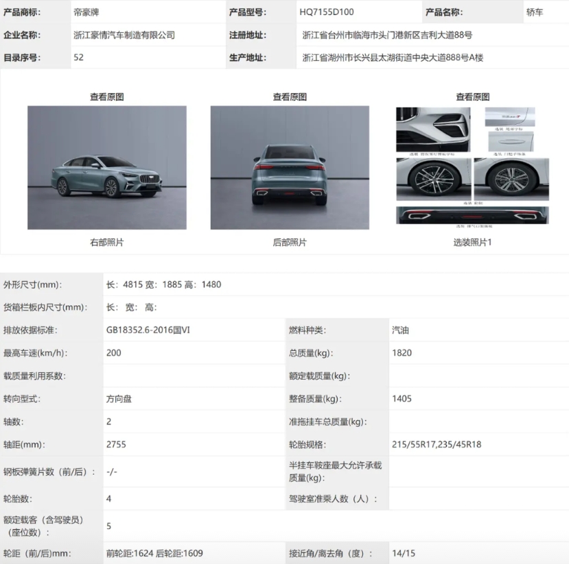 全新帝豪,这外观设计,够惊艳了吧! 长×宽×高:4815mm×1885mm×1480mm,比现款帝豪长了将近18公分! 轴距:2755mm,相比现款帝豪的2650mm,轴距加长了10公分,车内空间将会更加充裕! 轮胎尺寸:215/60R16,215/55R17,235/45/R18,太狠了[捂脸],帝豪都能用上18寸的轮胎了,这以后怕是只能称之为帝豪之王了[笑脸]! 发动机:匹配两款发动机 1.5L自然吸气版本,代号BHE15-CFN,功率88KW,估计还是匹配CVT变速箱; 1.5T涡轮增压版本,代号BHE15-EFZ,功率133KW,大概率会匹配七速湿式双离合变速箱了! 这台帝豪进化得有点猛,非常期待上市,又要把帝豪创造的佳绩再次刷新了!