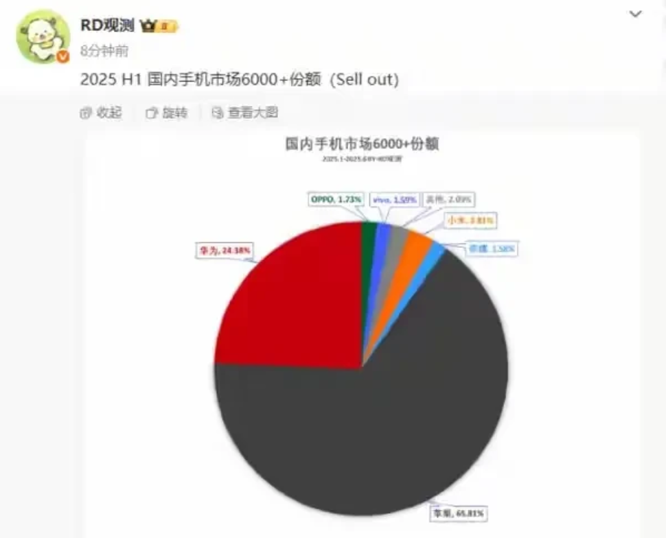 苹果🍎遥遥领先 苹果在国内高端市场的统治力依然无人能撼动,其65.81%的份额