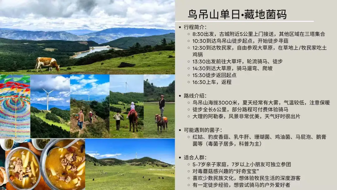 鸟吊山是不是只有爱心湖13公里一条线路可以走? 不是,还有更轻松,距离更短,更好玩的路线 轻徒步,菌子捡到爆,吃地道的藏式土鸡火锅,下午还可以骑马,内容相当丰富。 [一R]:拼团营,[三R][二R][八R]/人 人数上限14人,坐小巴车,中午是土鸡火锅,锅里有一些野生菌土豆和腊肉的。骑马单算[二R][零R][零R]/匹。 [二R]:4-6独立精品定制团,[五R][二R][八R]/人 5座SUV或者7座商务车,中午午餐还会有松茸和乳扇沙琪玛之类的小点心,包含2人一匹马。 隔天有 团