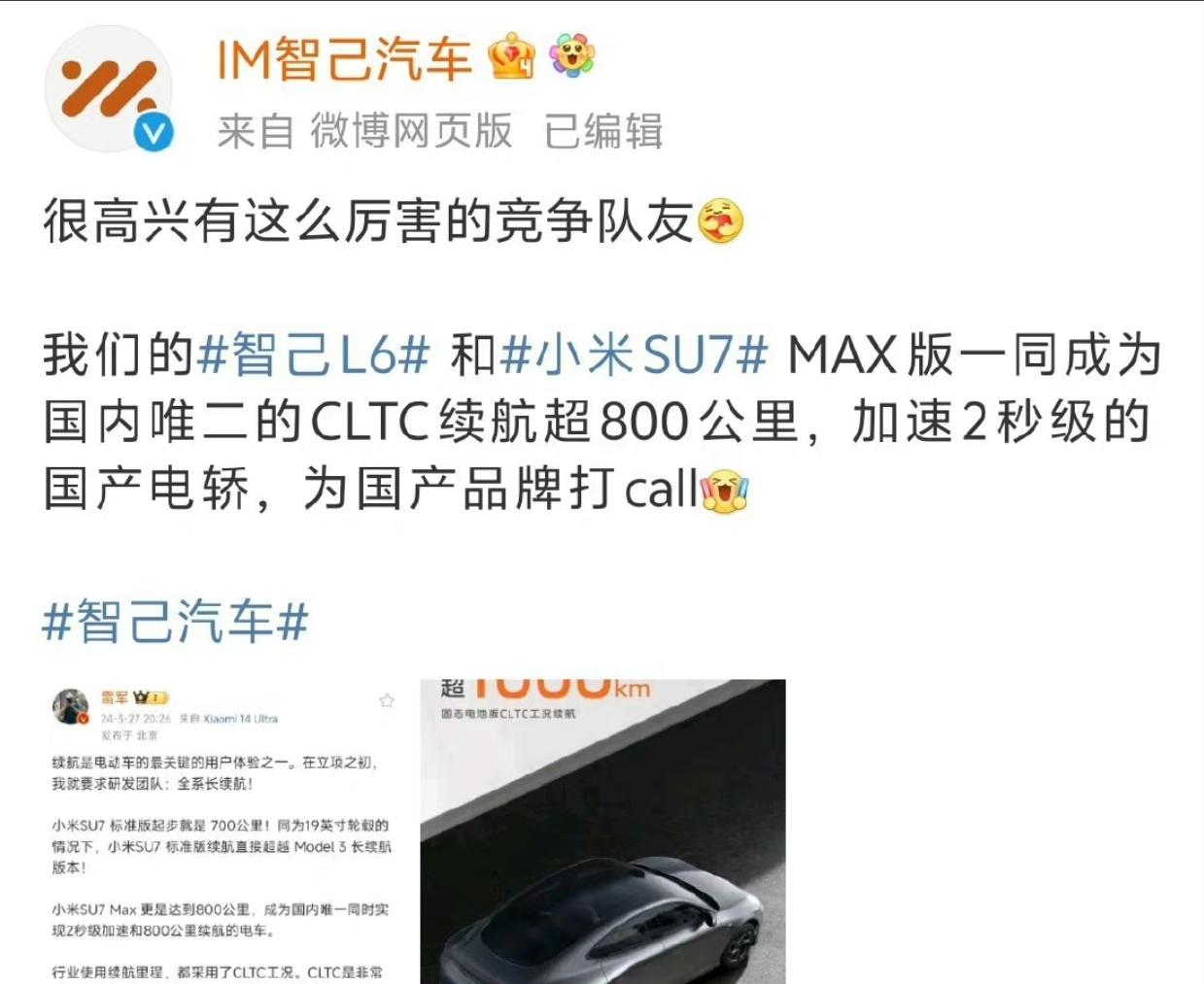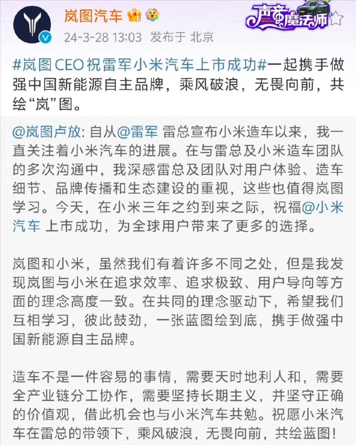 什么叫做格局!汽车大厂纷纷向小米发来祝贺!祝小米汽车SU7发布圆满成功!在一起,才是中国汽车!民族情怀直接拉满!小米 雷军 小米SU7 阿凯同学