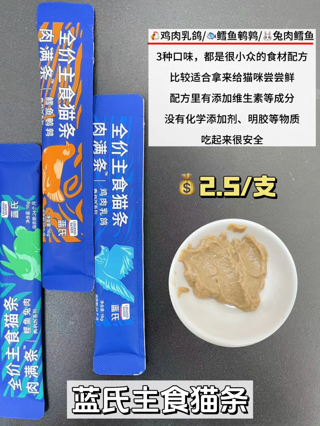 3种口味,都是很小众的食材配方,比较适合拿来给猫咪尝尝鲜。配方里有添加维生素等成分,没有化学添加剂、明胶等物质,吃起来很安全。